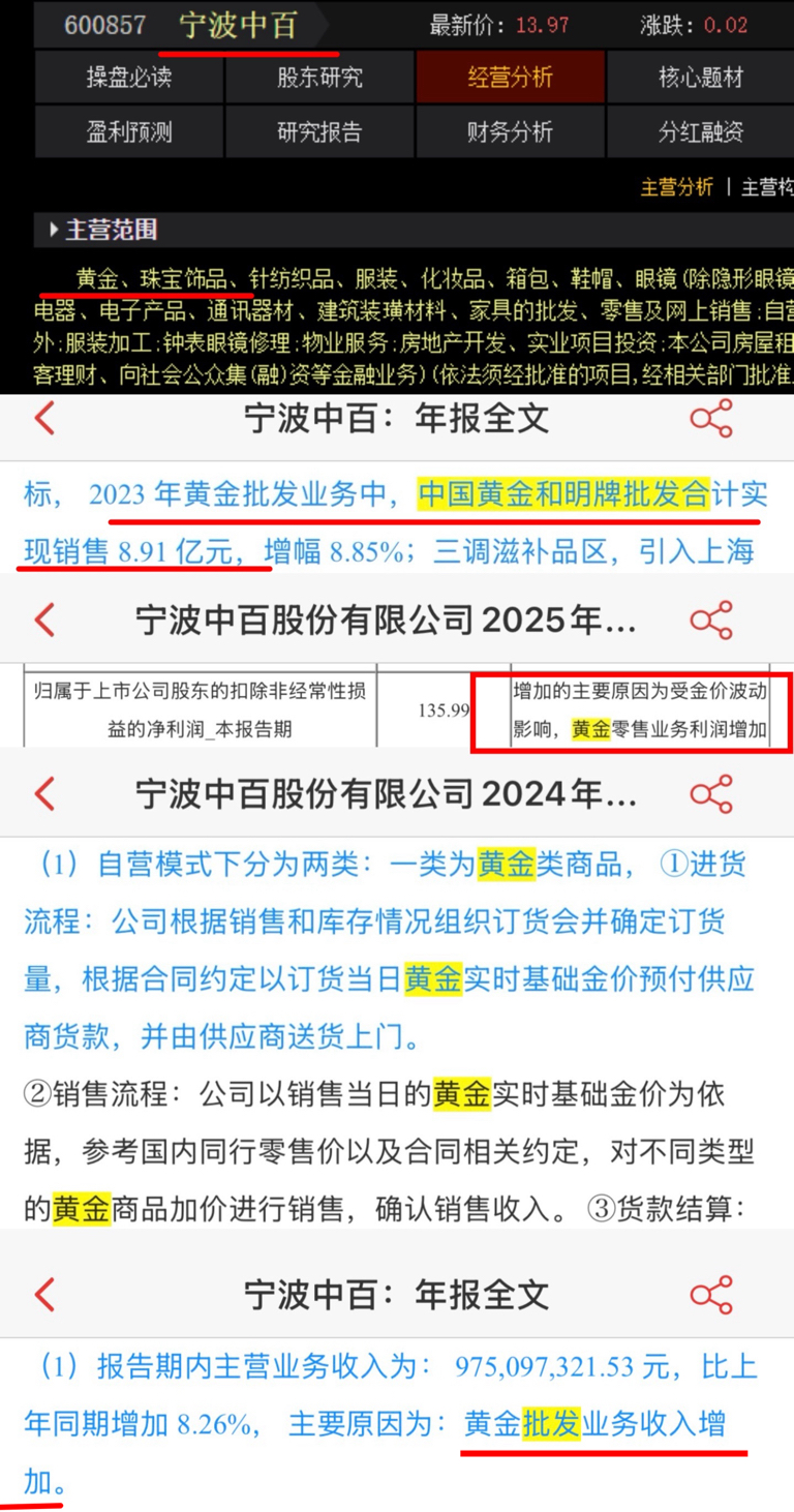 上游黄金暴涨,是时候交易下游黄金批发和零售了,宁波中百的主营业务排第一的就是黄金,黄金批发和零售业务占比非常大,2023年年报显示,2023 年黄金批发业务中,中国黄金和明牌批发合计实现销售 8.91 亿元;公司年报也说明了金价上涨公司黄金零售业务利润也会增加,因为黄金批发业务收入增加。