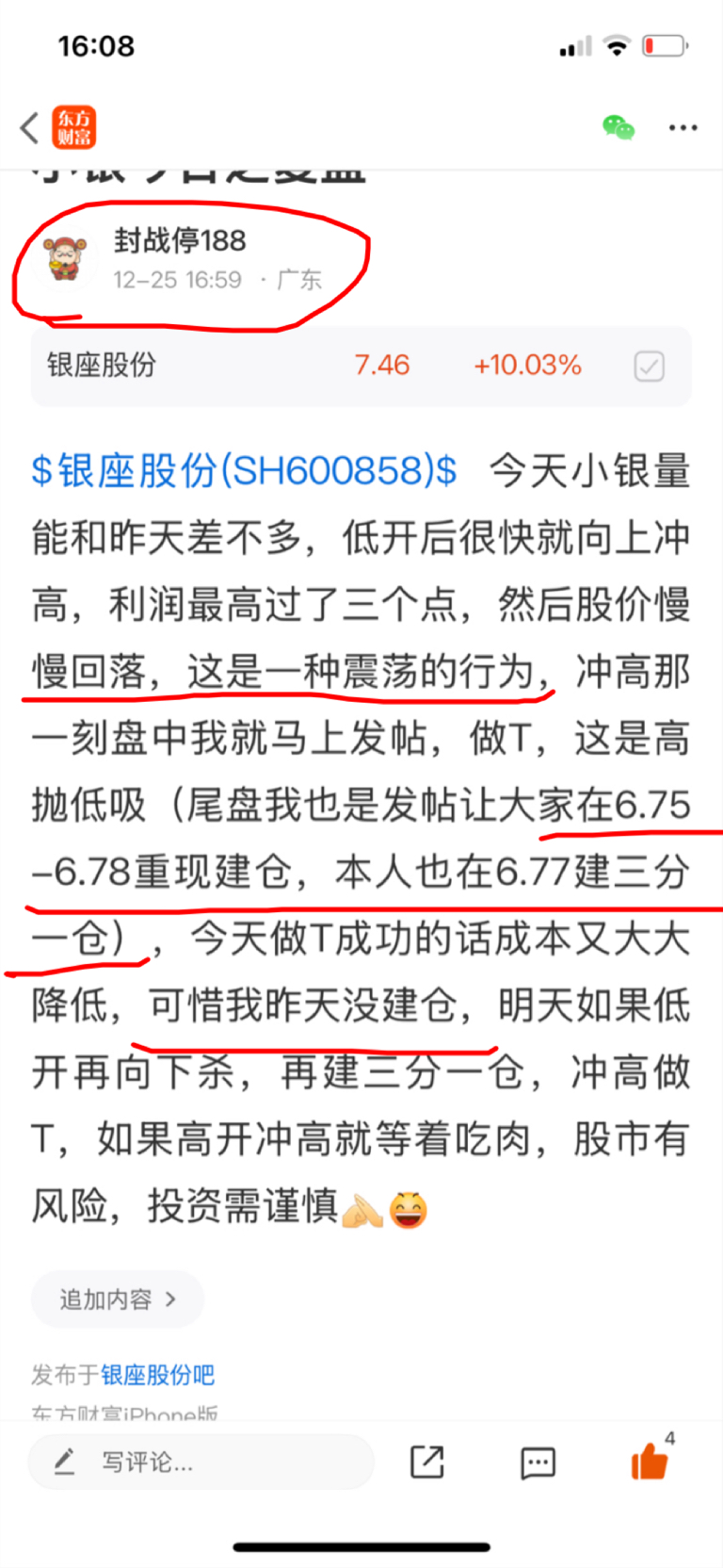 $银座股份(SH600858)$ 今天小银缩量涨停,完成符合昨天的复盘分析,由于昨天才建底仓,今天没低吸的机会,没能做T,但我盘中也及时发帖,让那些满仓或者三分二仓的股友可以考虑做T,抛掉一点仓位(不过没抛也没所谓,抛掉一点仓位只不过是保守的做法),下星期一如果高开迅速涨停就继续保留仓位,如果低开再冲低就再进三分一仓,盘中反抽就做T(怕回调一两天),股市有风险,投资需谨慎