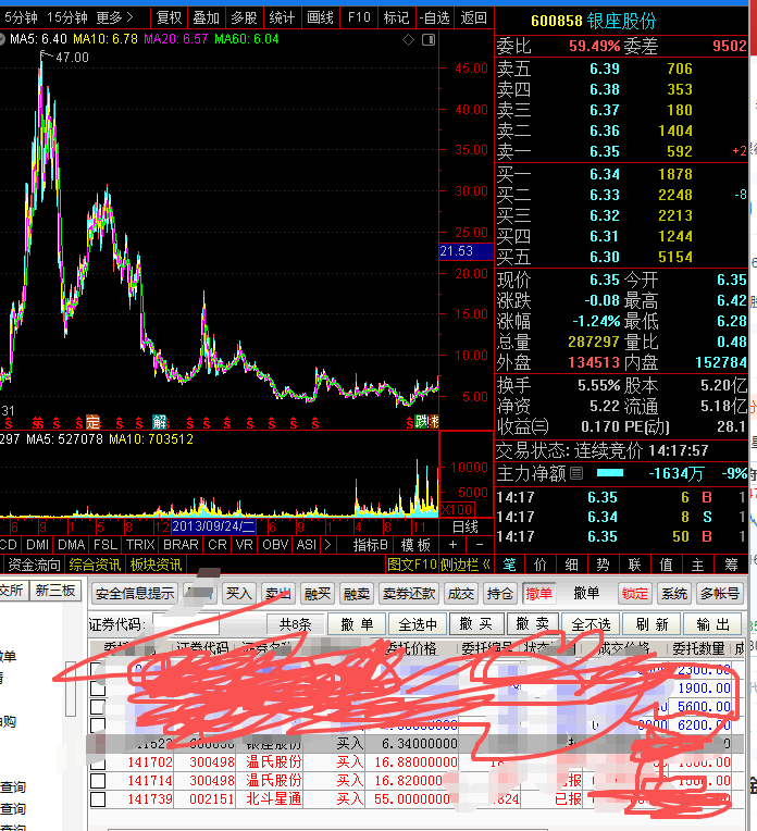 1月7挂单:指数待补缺口,银座6.34现价挂单等进。今天的单子比较少就这几个布局