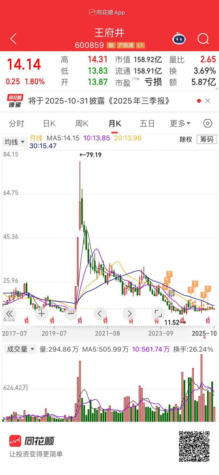 $王府井(SH600859)$ 书上说,三季度利润1.23亿,预计全年利润1.5亿,给予20倍估值,合理市值30亿,总股本11.24亿股,计算每股股价2.66元。