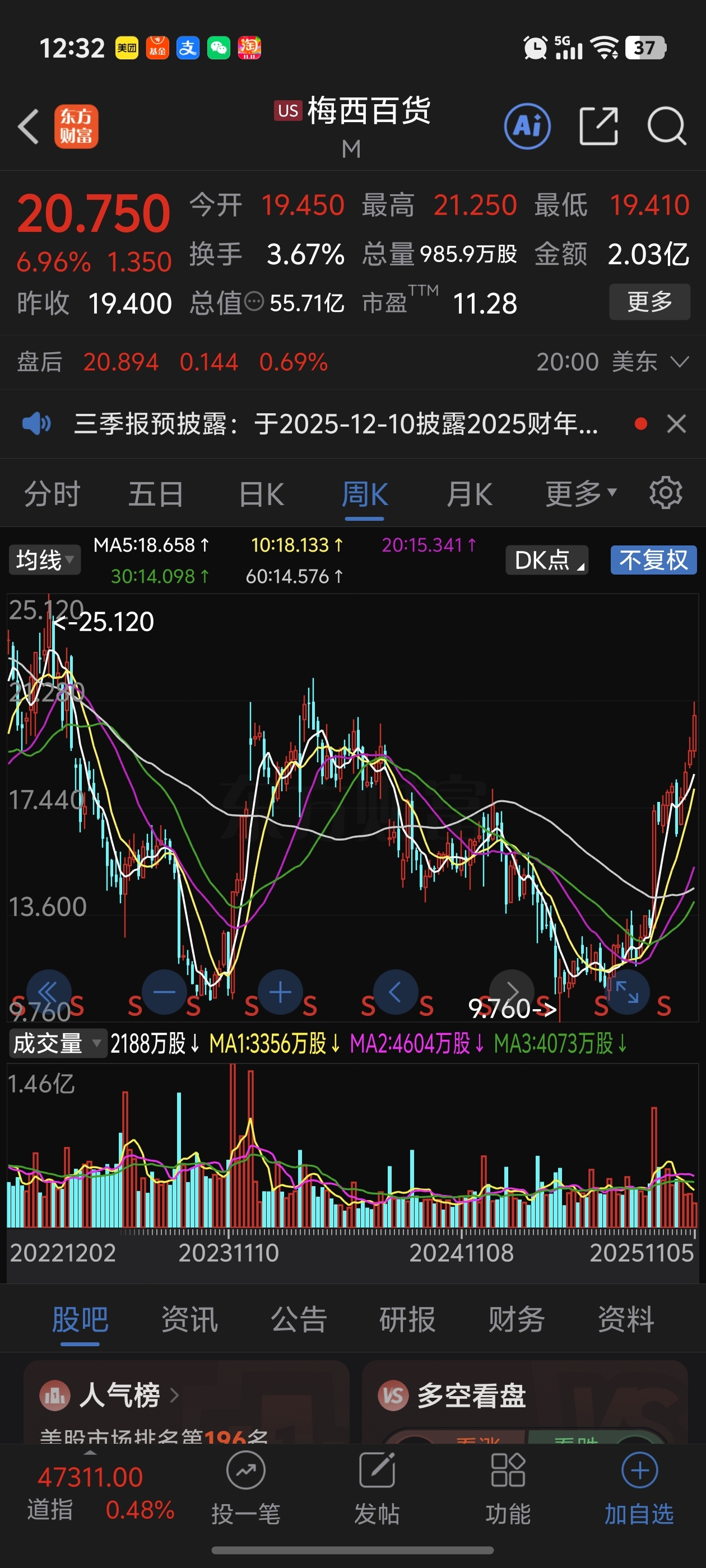 梅西百货都涨一倍市盈率多才还11倍,再看看你得多高估