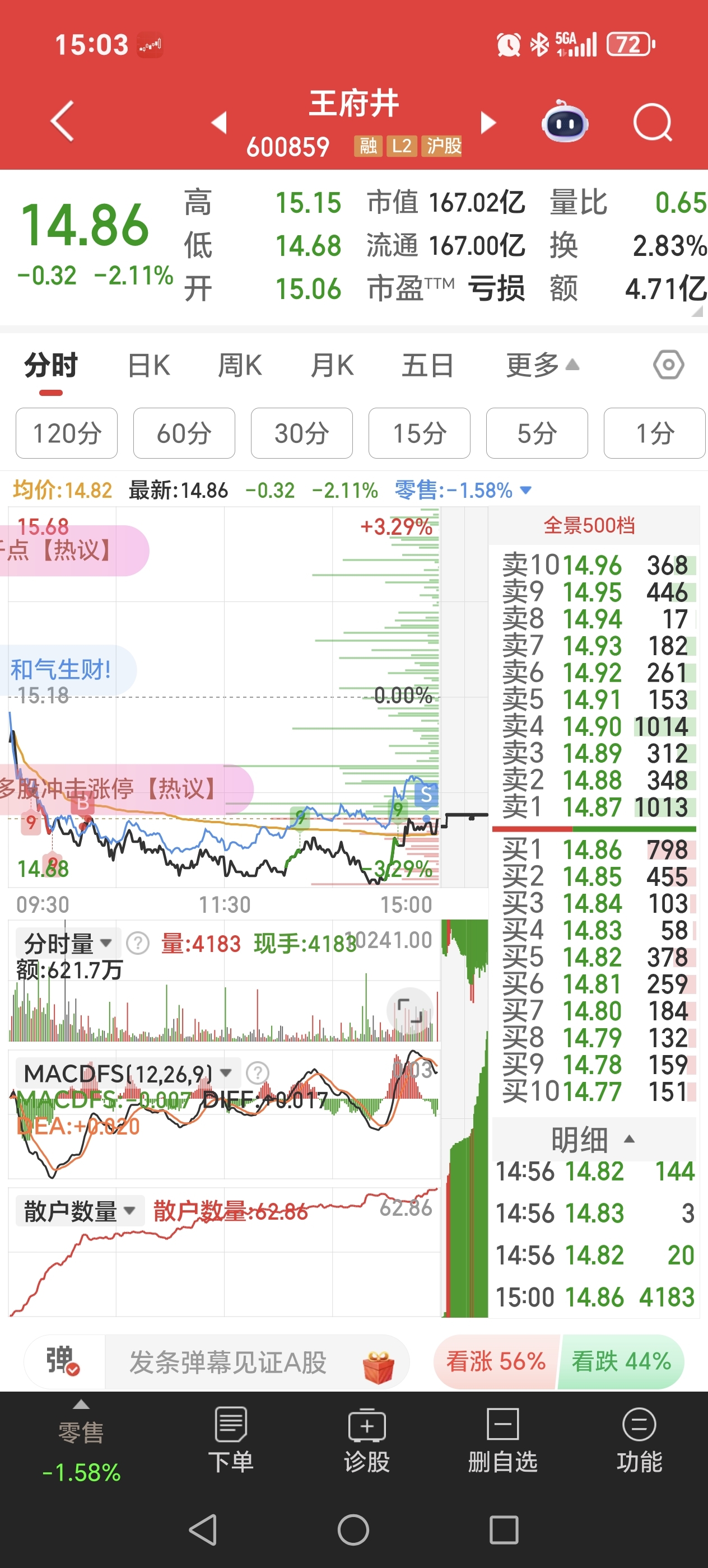 $王府井(SH600859)$ 一天白玩,整体是加仓的,尾盘出了今天买入的一半