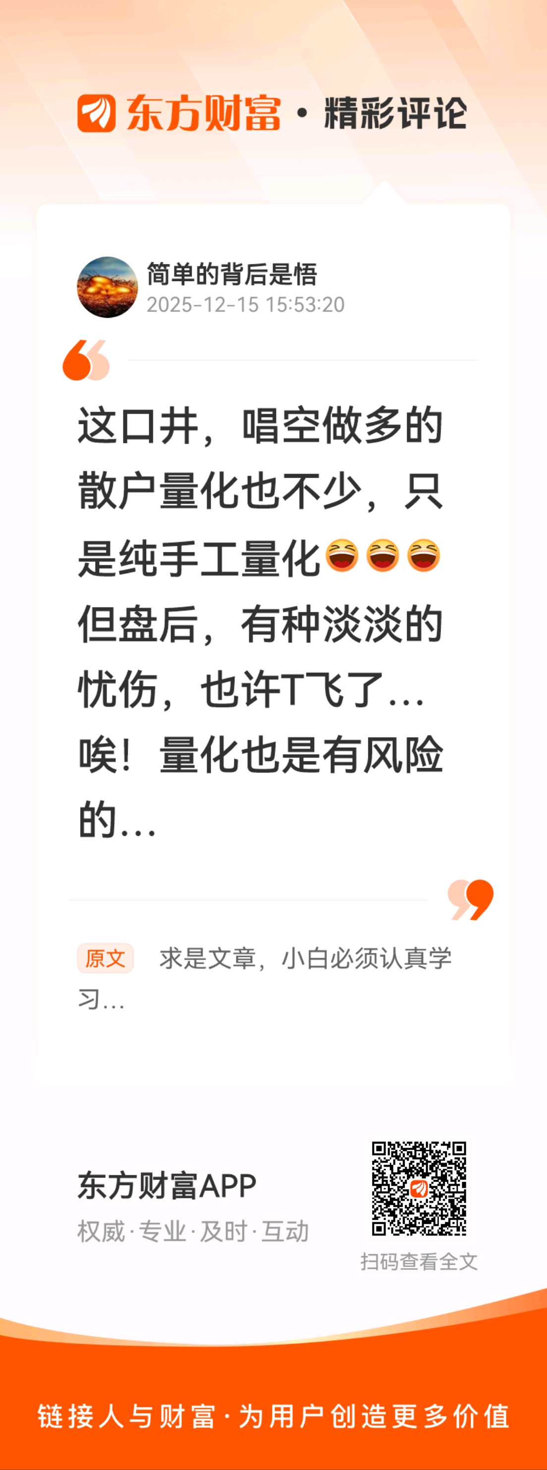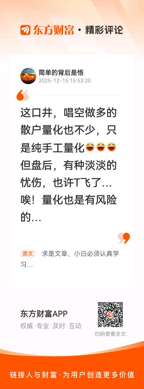 //@简单的背后是悟 :这口井,唱空做多的散户量化也不少,只是纯手工量化但盘后,有种淡淡的忧伤,也许T飞了…唉!量化也是有风险的…