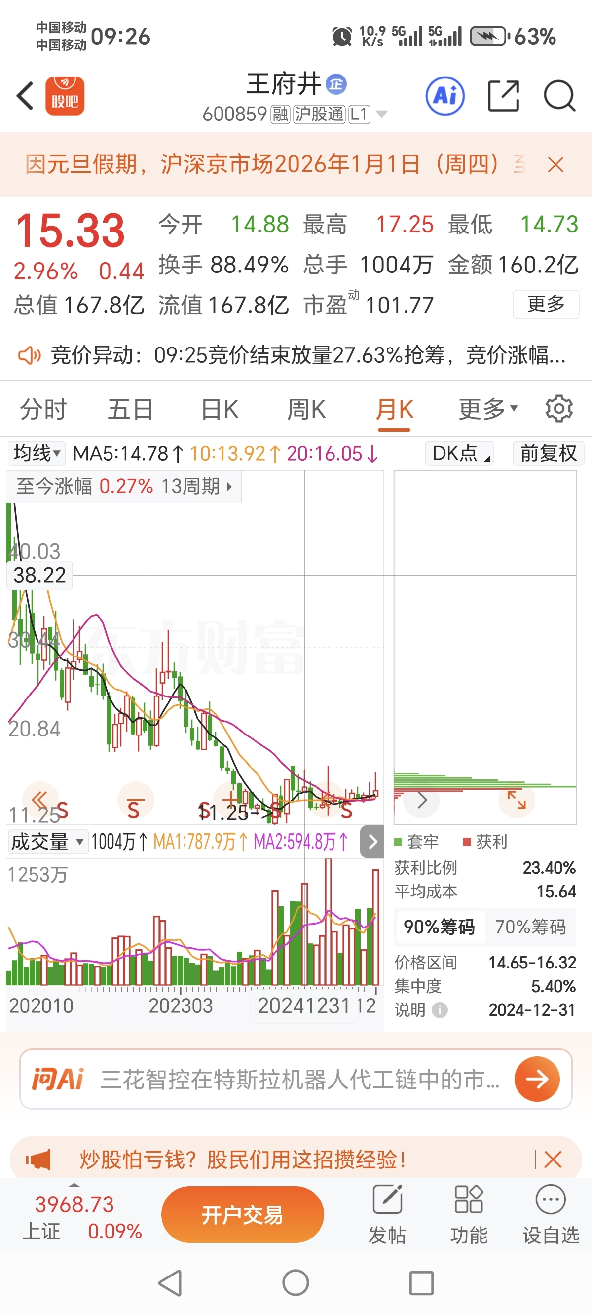 $王府井(SH600859)$ 去年年底15.33,一年了,大盘涨到4000,你反而跌