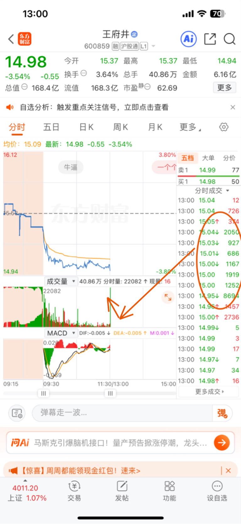 $王府井(SH600859)$ 哪个键人,开盘第一分钟就砸盘,万手大单往下砸,