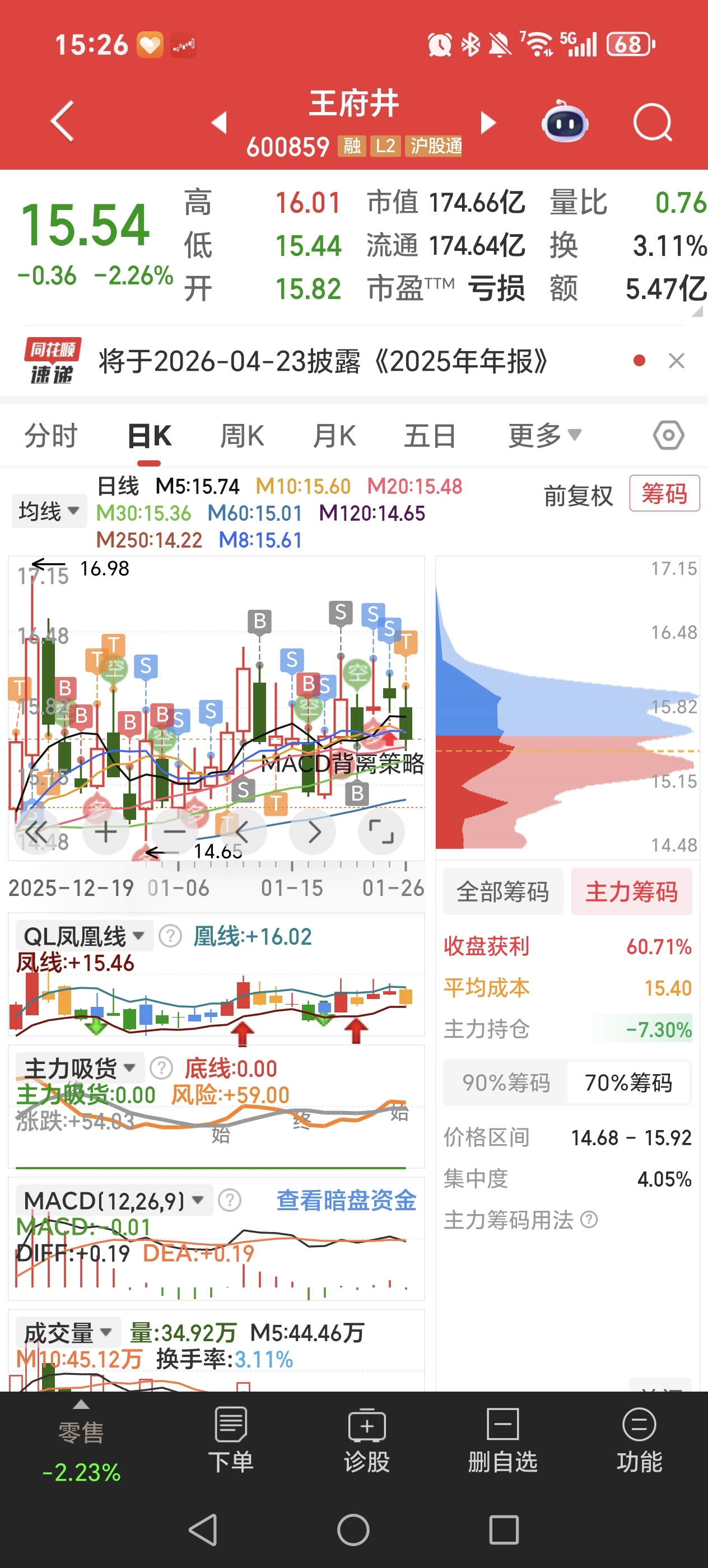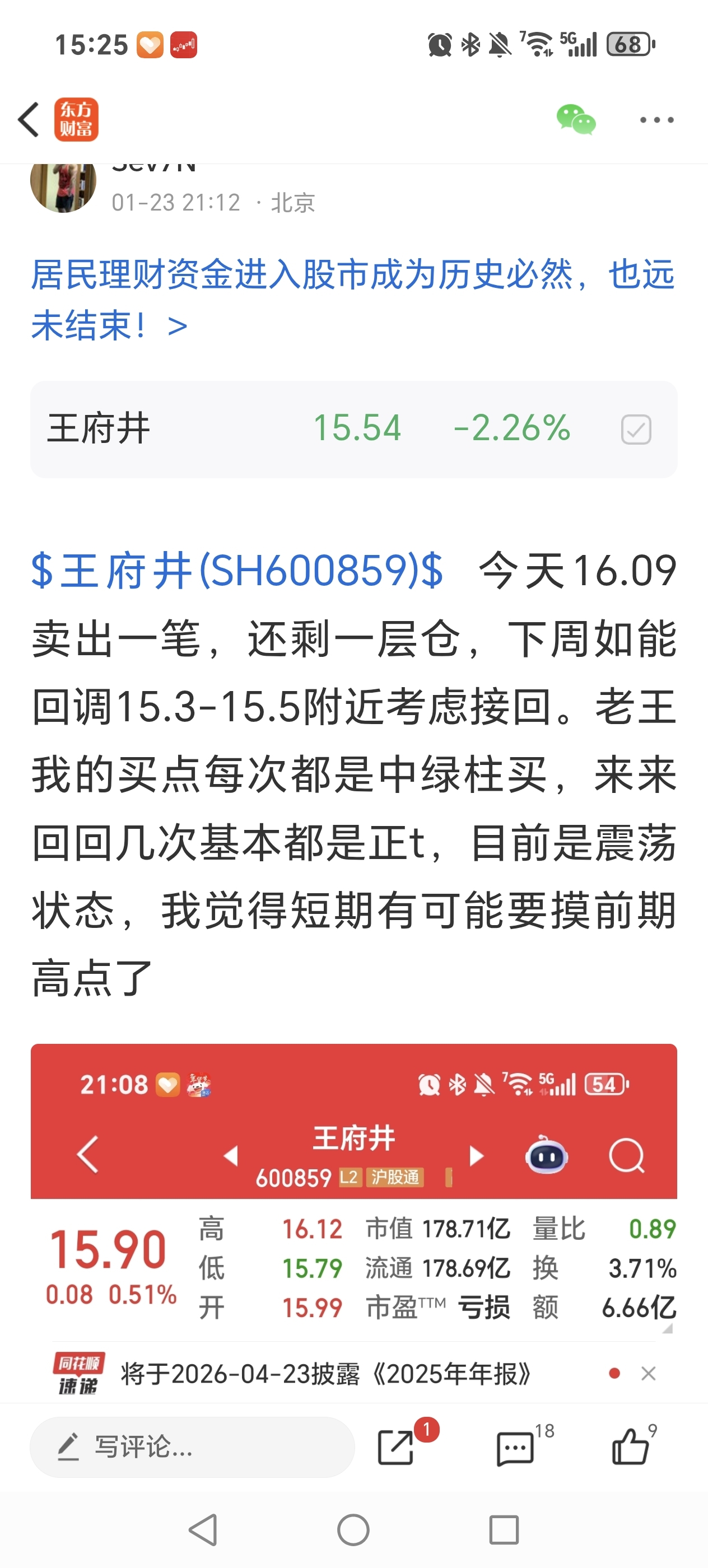 上周说了等15.3-15.5附近尝试做低吸,今天15.8卖15.46接回来一些,