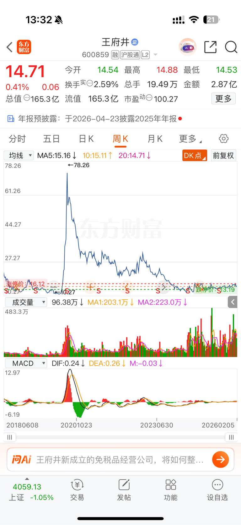$王府井(SH600859)$ 消费总龙头怎么跌到脚脖子了