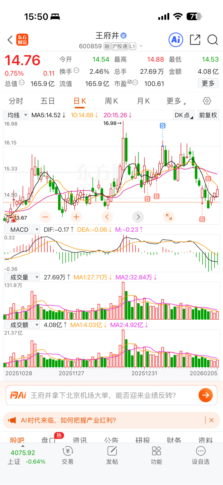 $王府井(SH600859)$ 明天低开是肯定的,就看能不能4连阳,按照股性来讲明天下探2个点左右…