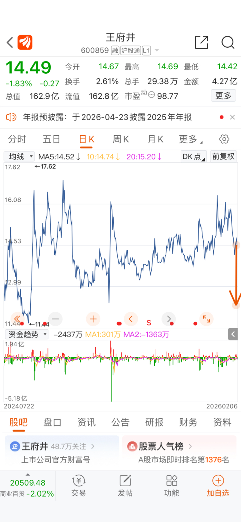 $王府井(SH600859)$ 明天再跌一天,大家不是都炸了么。难道真跌到11去