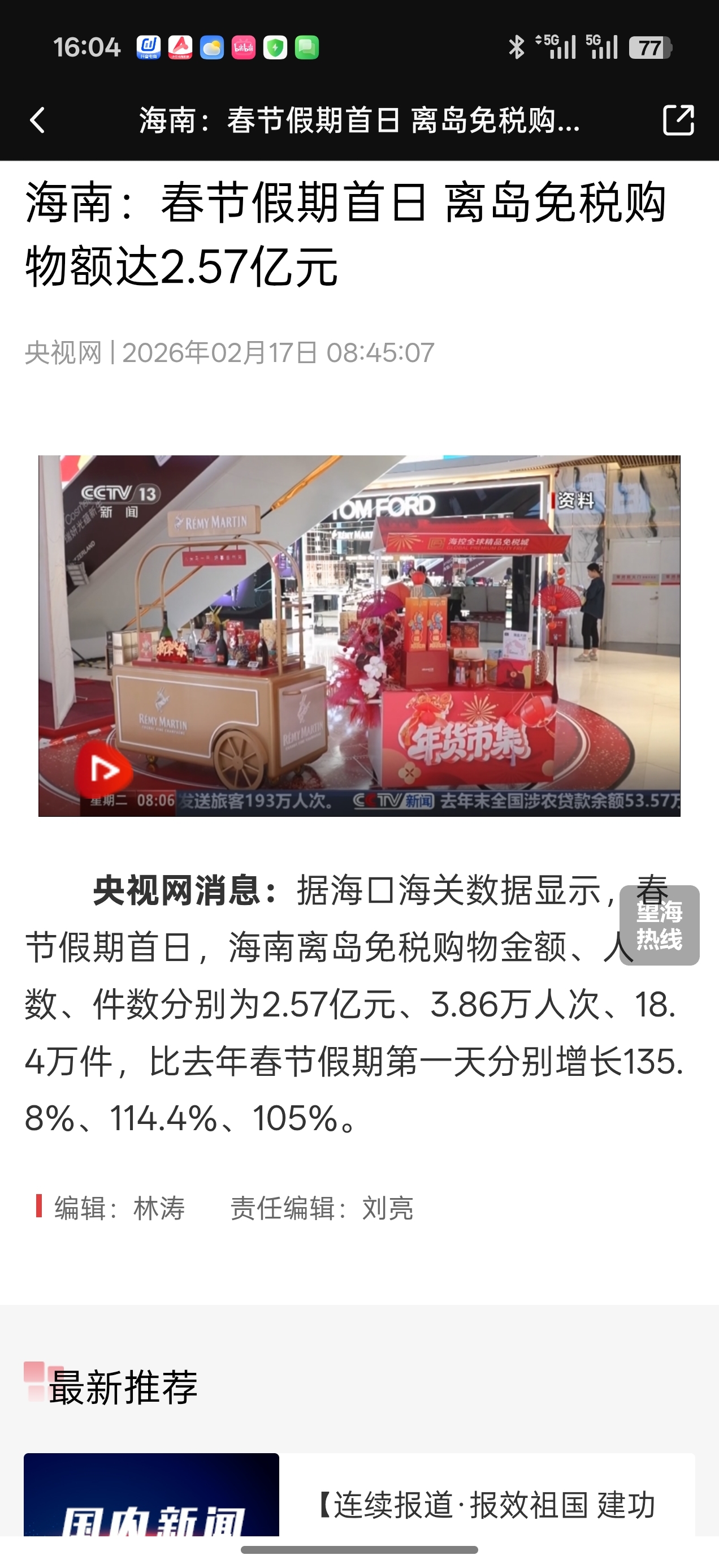 海南离岛免税购物金额、人数、件数分别为2.57亿、3.86万人次、18.4万件,比去年春节假期第一天分别增长:135.8%、114.4%、105%。
