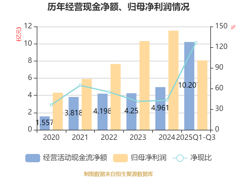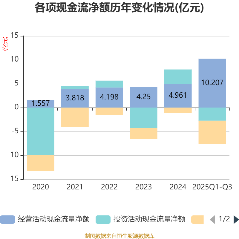2025年前三季度,公司经营活动现金流净额为10.21亿元,同比增长621.17%;筹资活动现金流净额-4.87亿元,同比减少3.13亿元;投资活动现金流净额-2.74亿元,上年同期为-4720.74万元。