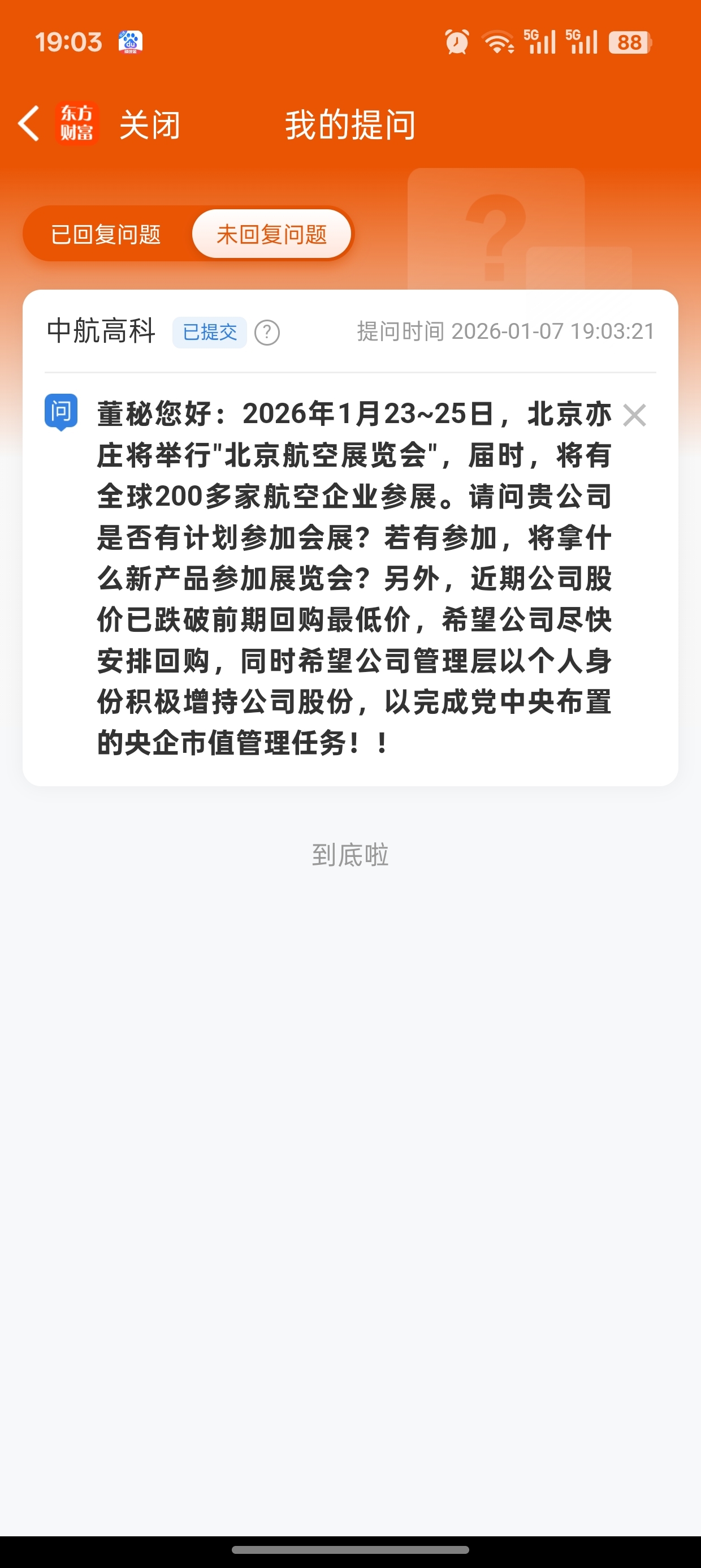 $中航高科(SH600862)$ 董秘您好:2026年1月23~25日,北京亦庄将举行"北京航空展览会",届时,将有全球200多家航空企业参展。请问贵公司是否有计划参加会展?若有参加,将拿什么新产品参加展览会? 另外,近期公司股价已跌破前期回购最低价,希望公司尽快安排回购,同时希望公司管理层以个人身份积极增持公司股份,以完成党中央布置的央企市值管理任务!!