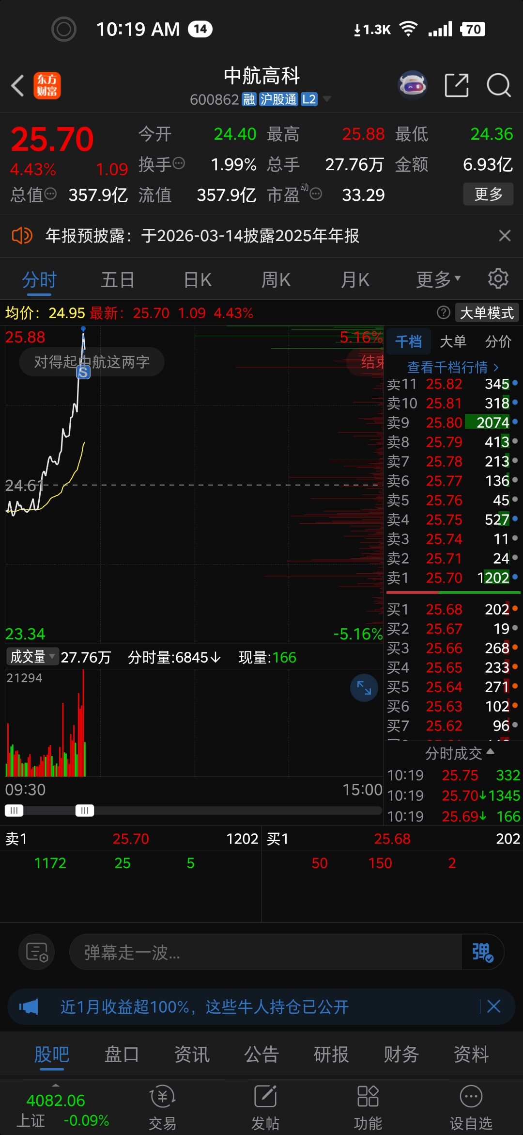 $中航高科(SH600862)$ 到达上次阻力区域,主动t掉昨天进的筹码,盘子太大不好整啊,中长线持有底仓,坚决看好