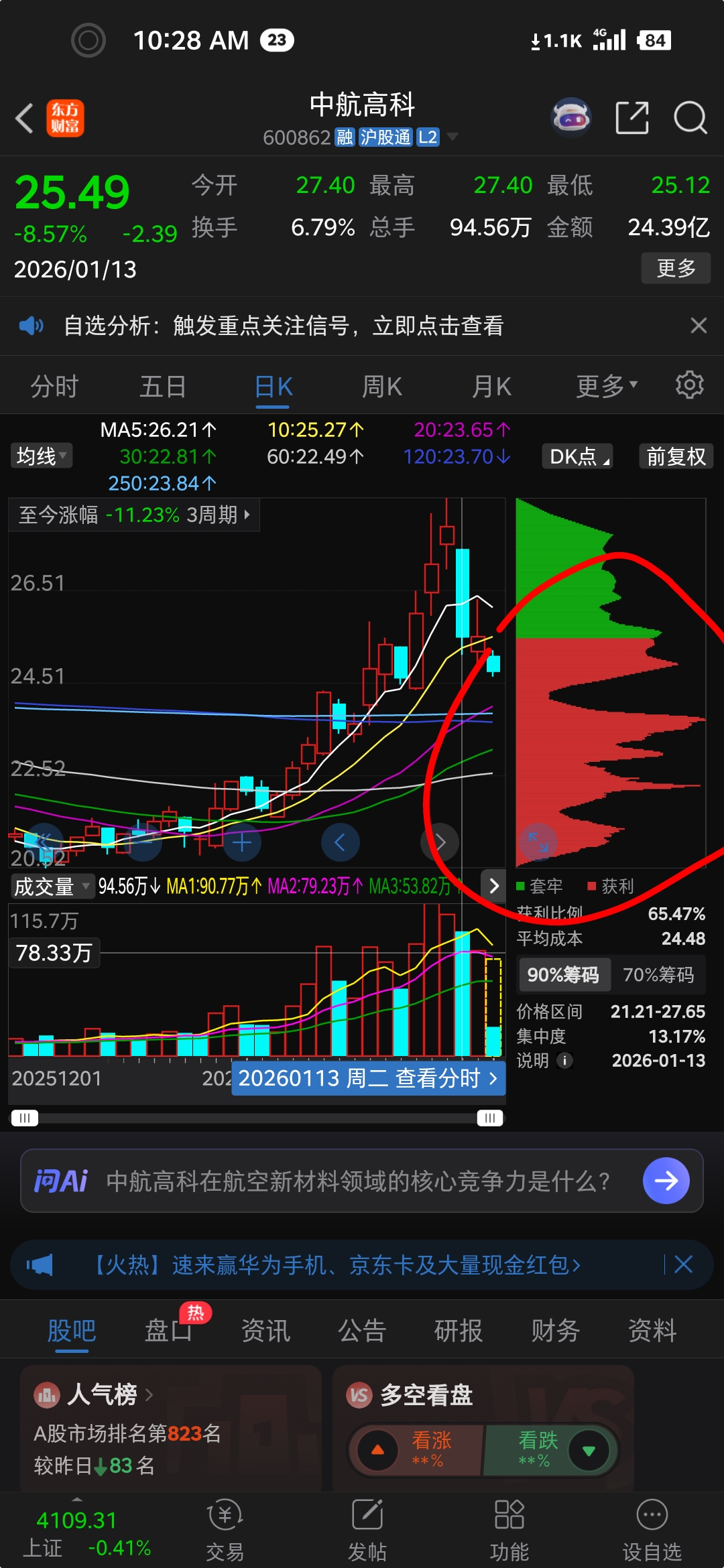 $中航高科(SH600862)$ 底部的筹码峰高位时只出了一点,砸大阴线那天没怎么变动,反而这两天流出不少,底部筹码松动了,底部便宜筹码离场也有好处,分歧加剧,新进来的也不想抬轿