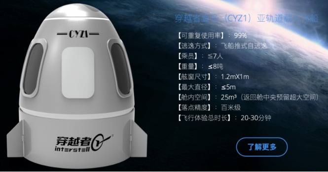 穿越者官网显示,穿越者壹号(CYZ1)亚轨道载人飞船可重复使用率达99%,采用飞船推式自逃逸,乘员≦7人、重量≤8吨、舷窗尺寸为1.2m×1m、最大直径≤5m、舱内空间25m³(返回舱中央预留超大空间)、落点精度为百米级、飞行体验总时长为20—30分钟。