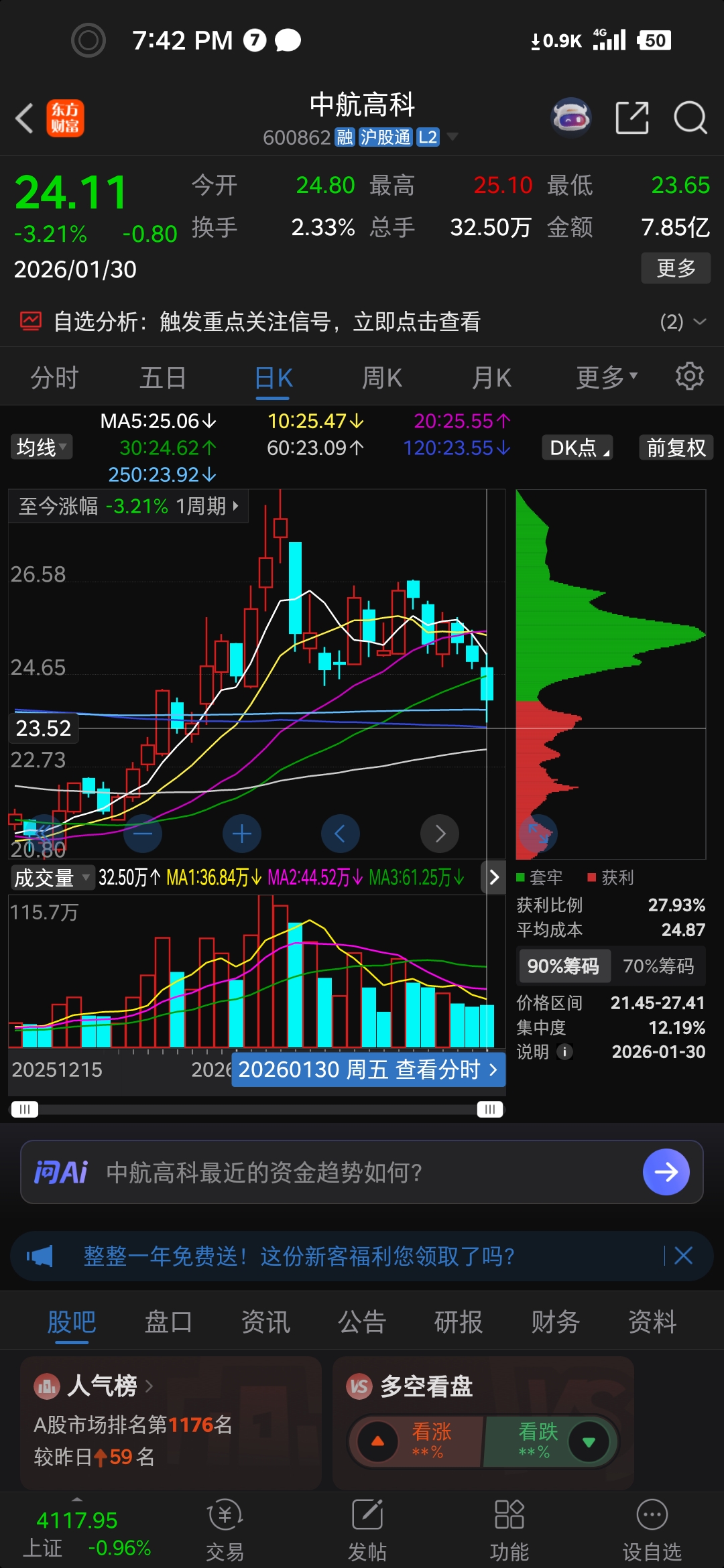 $中航高科(SH600862)$ 我觉得会在23.50支撑位附近横盘整理一段时间,等高位筹码割肉后形成低位单峰密集筹码峰爆发力度更大,这一月份量能摆在这里,量能不会骗人,这月最低23.60,想埋这月进场的300亿资金,就要靠大盘和板块狠砸才行……