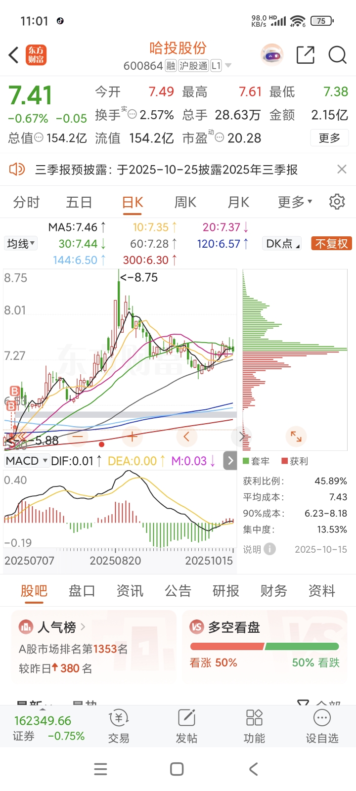 哈投股份,一晃三个月过去了,从7月10日到10月15日,期间没有一点操作,感觉时