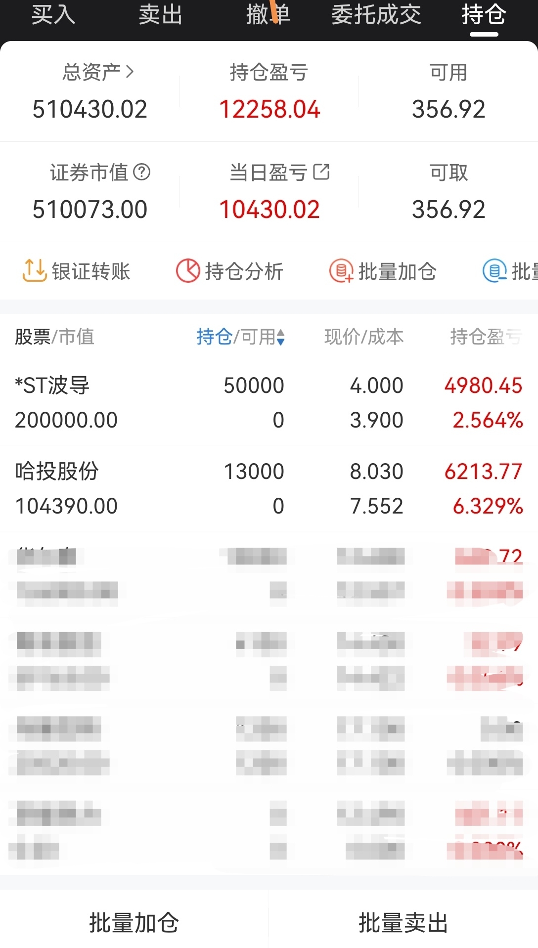 $哈投股份(SH600864)$ $*ST波导(SH600130)$ 大家好,我是蛋哥,炒股50万实盘第一天,哈投股份涨涨涨!今天账户盈利+10430.2元!