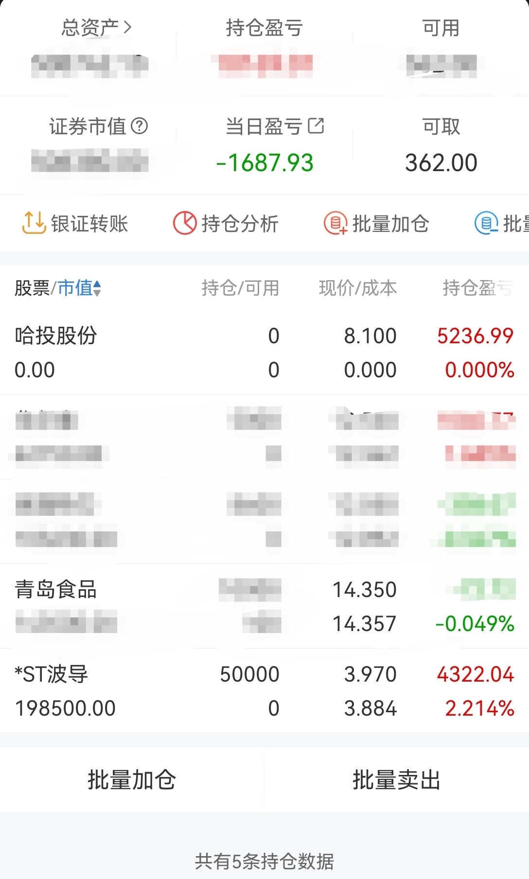 $哈投股份(SH600864)$ $青岛食品(SZ001219)$ $*ST波导(SH600130)$ 又是科技股的牛市,科技股即使涨上天我也不会买,哈投水下跑路了,不做龙头非得要这么琐,波导没办法,4.2元再考虑出,新开仓青岛食品,看一下今晚的三季度报!今天亏损-1687.93元!