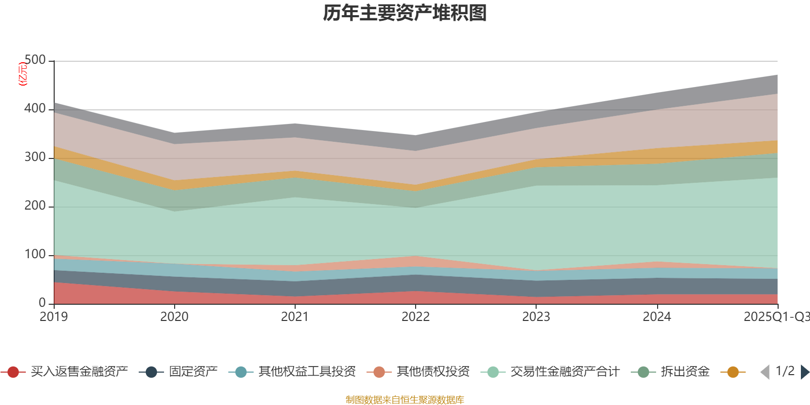 资产重大变化方面,截至2025年三季度末,公司交易性金融资产合计较上年末增加18.65%,占公司总资产比重上升3.38个百分点;其他债权投资较上年末减少96.83%,占公司总资产比重下降2.88个百分点;货币资金较上年末增加20.83%,占公司总资产比重上升2.08个百分点;结算备付金较上年末减少18.89%,占公司总资产比重下降1.86个百分点。