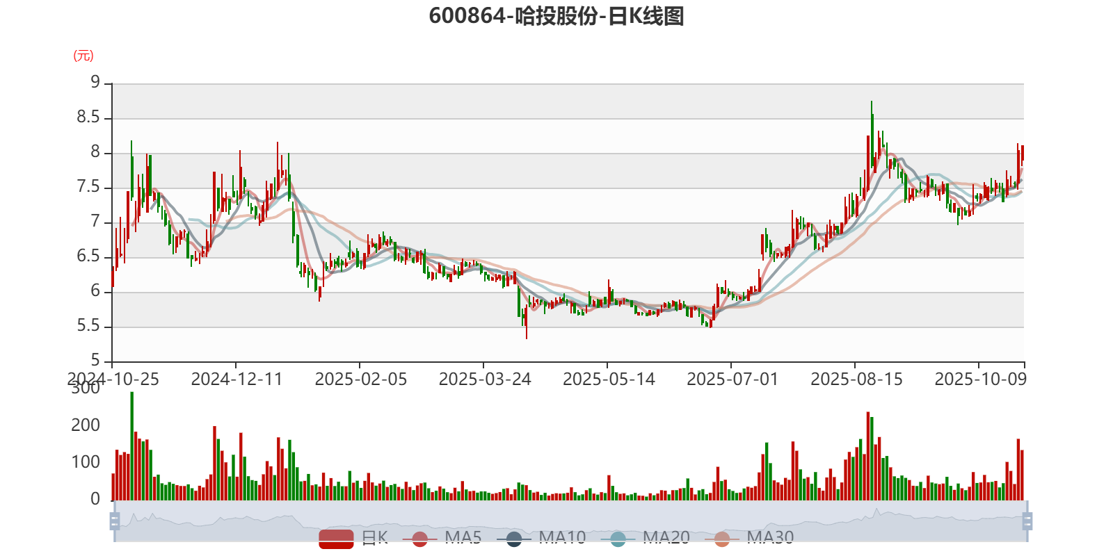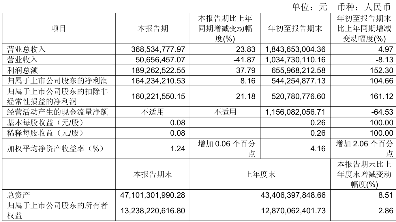 中证智能财讯哈投股份(600864)10月25日披露2025年第三季度报告。前三季度公司实现营业总收入18.44亿元,同比增长4.97%;归母净利润5.44亿元,同比增长104.66%;扣非净利润5.21亿元,同比增长161.12%;经营活动产生的现金流量净额为11.56亿元,同比下降64.53%;报告期内,哈投股份基本每股收益为0.26元,加权平均净资产收益率为4.16%。