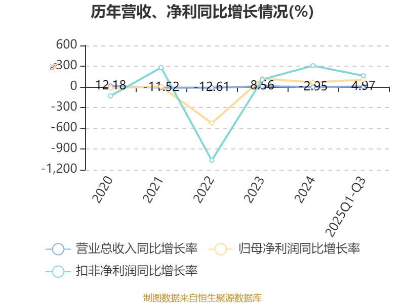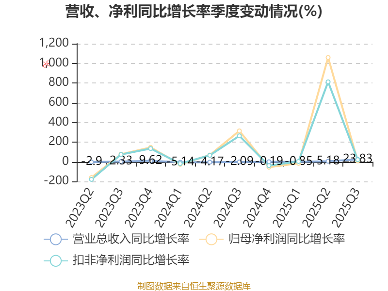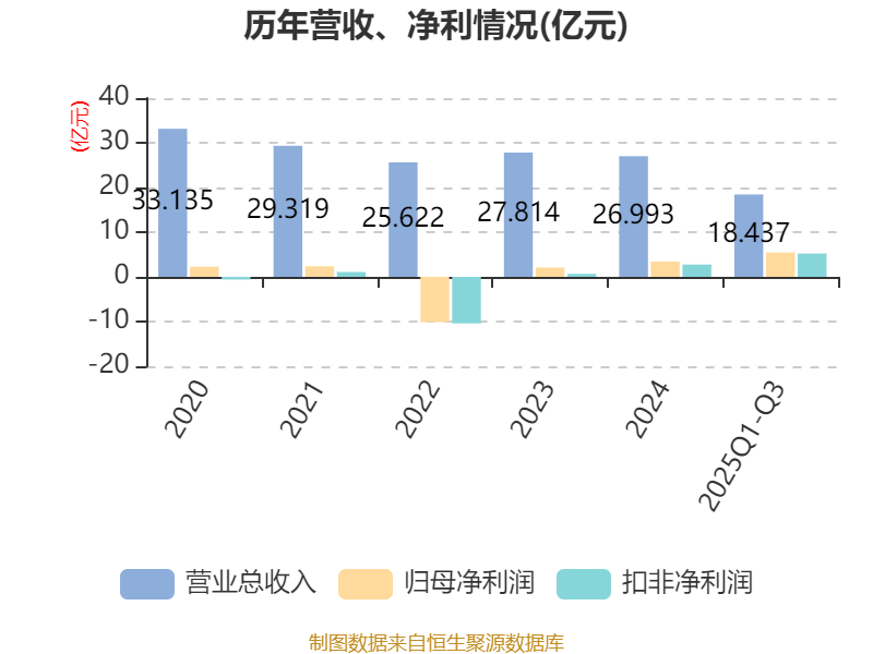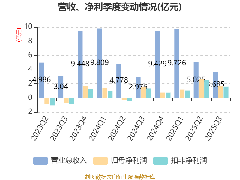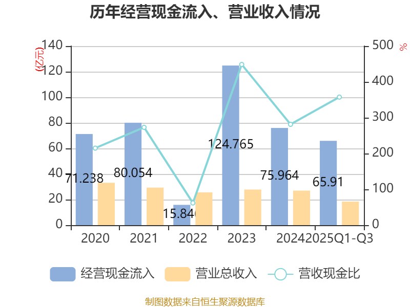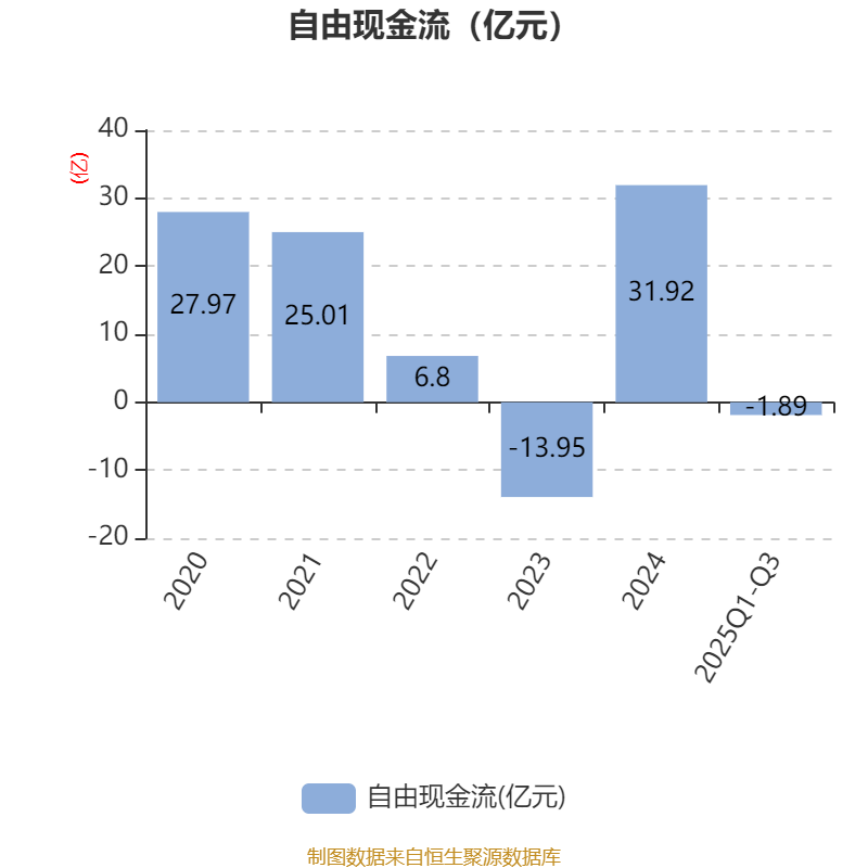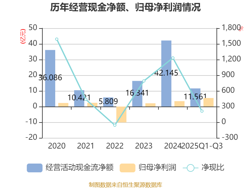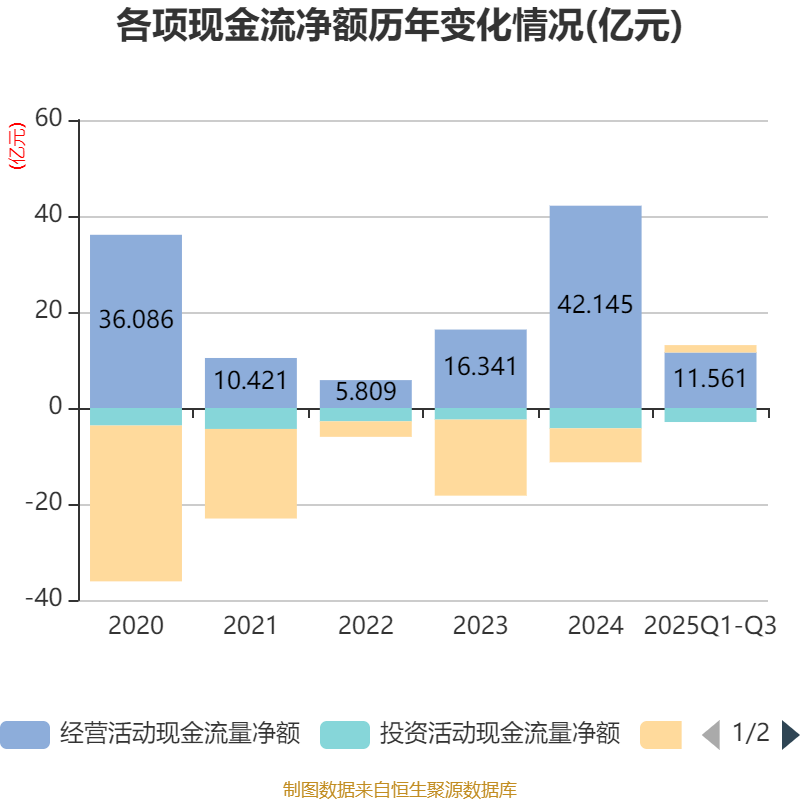 2025年前三季度,公司经营活动现金流净额为11.56亿元,同比下降64.53%;筹资活动现金流净额1.54亿元,同比增加13.29亿元;投资活动现金流净额-2.92亿元,上年同期为-2.24亿元。