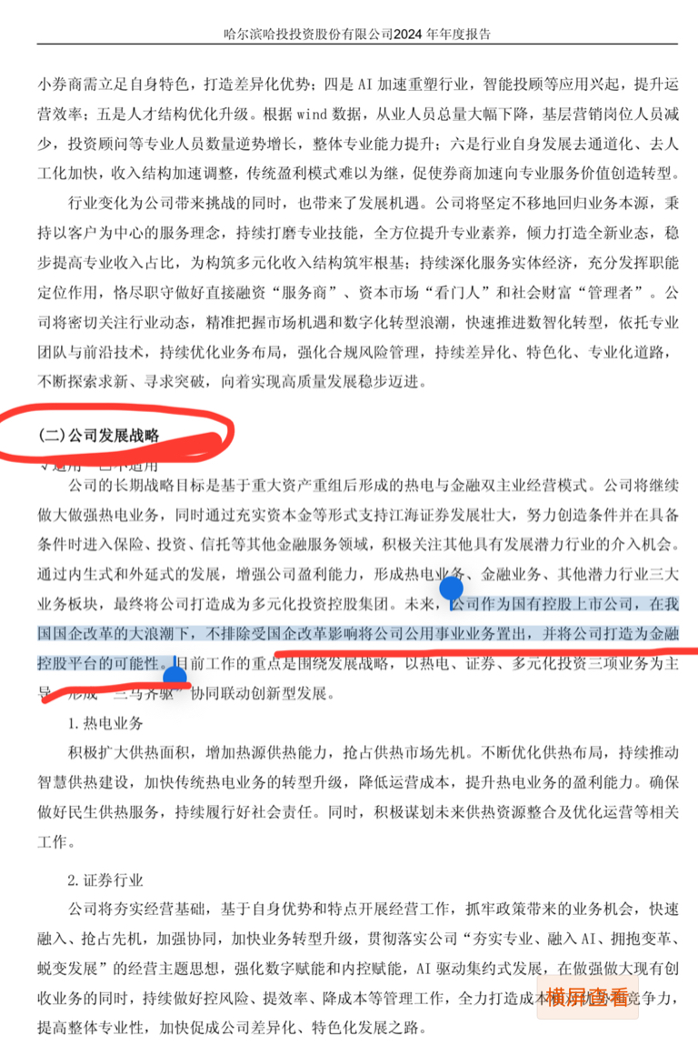 哈投股份今年公告中的战略预期:哈投股份作为国企改革发展需要,目前的券商 热电双主业,不排除将公共事业业务(热电)置出,信托业务注入,打造哈投金控平台。