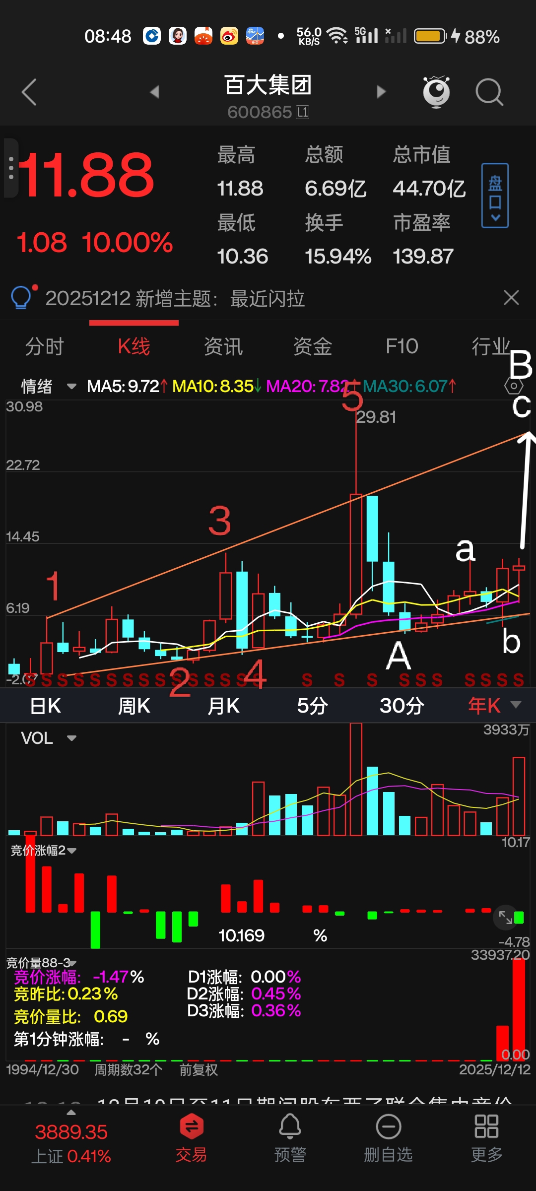 $百大集团(SH600865)$ 完整浪形分析,B浪目标30