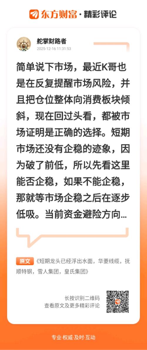 昨天市场本来保险已经把市场给带动了,但还是有点力不从心,今天K哥会继续关注保险板块的带动作用,同时从K线形态上看,这里出现了一个小级别的冲高回落走势,说明目前大盘20日线附近还是有压力的。这里看看1~3天内能否收复,否则趋势还是向下。而趋势向下有个最大的问题,可能很多人没留意。就是资金会抱团,虽然作为短线来说资金抱团是好事,但是从跟踪的角度看,未必。因为一旦资金抱团,那么市场的容错率就会大大降低,比如平潭发展,如果按照之前跟踪热点的角度去看,其实已经结束了。但是站在资金抱团的角度去看,目前没有合适的板块用于炒作,所以短线资金只能回流抱团,这就是当前抱团股看来看去总是那几个的原因,但是整个市场,涨的就这几个。想想看,是不是容错度太低呢?所以目前在紧盯核心主线的情况下,还是控制好仓位。目前还是继续盯消费板块,重点看年底这波消费炒作能否真的走出主线行情,毕竟,市场从8月底到现在,已经调整了接近4个月了,所以现在是需要密切关注市场动向的时候了。同时老热点,回踩重要均线的也是值得留意的。