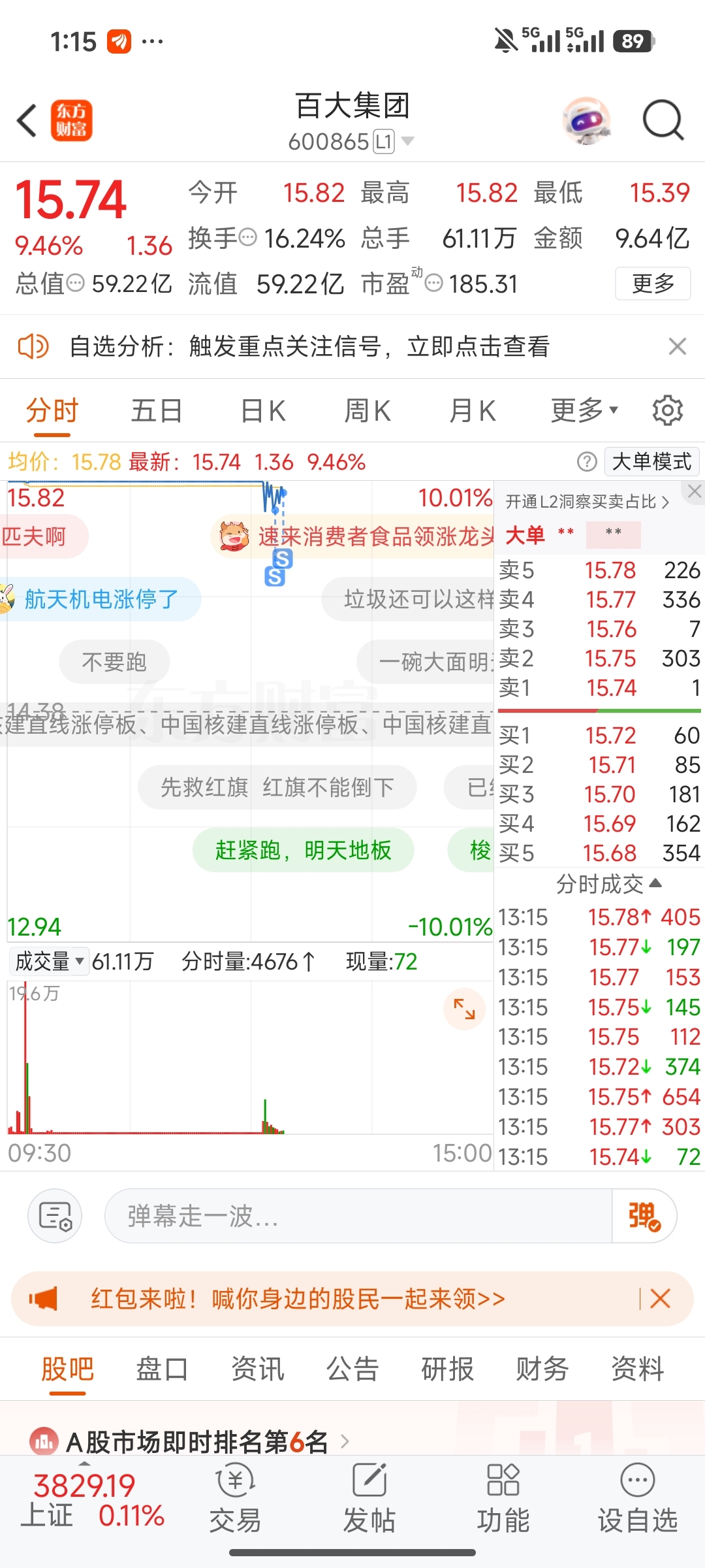 $百大集团(SH600865)$ 百大集团,谢谢你!获3板。