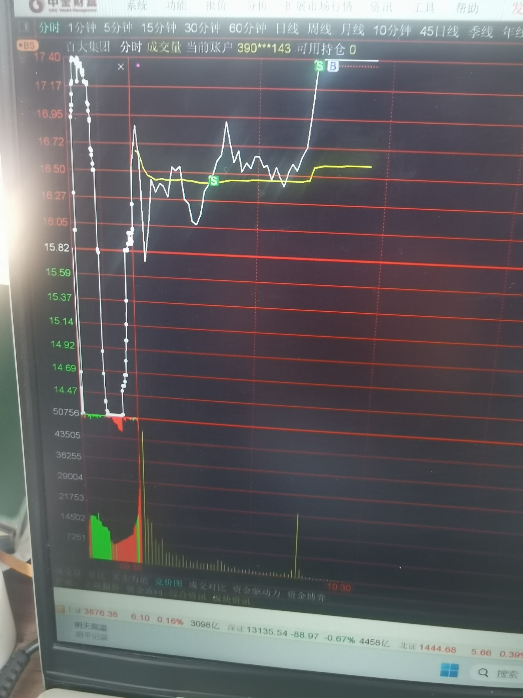 $百大集团(SH600865)$ 还是我的心理素质不行,本身也年龄大了,今天又出现了一次,要在板上买股票,结果卖了,中途在黄线处卖了2000股,不管他将来走的怎么样,但是今天的还是我的买入点,是我的操作,造成的后果