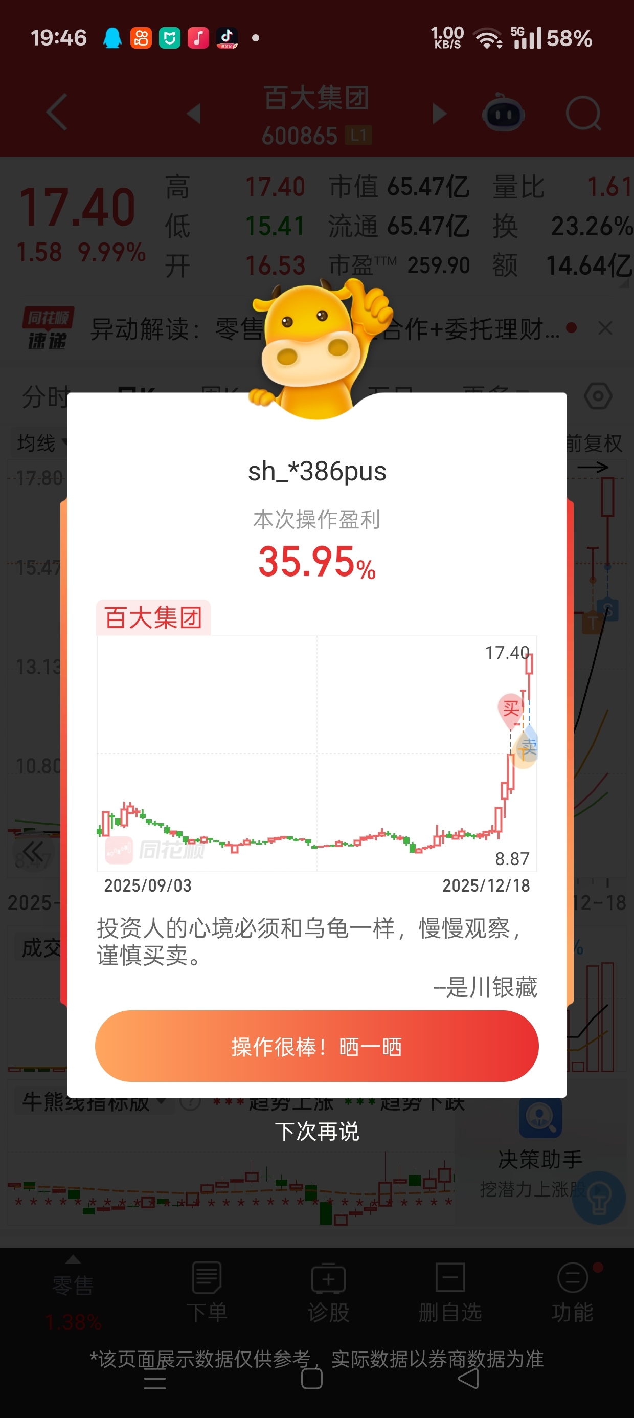 $百大集团(SH600865)$ 谢谢百大集团, 因为现在市场基本过不了7板,,所以今天卖了,抄底了安记食品!看好安记食品 福建泉州的!安记准备2波了!