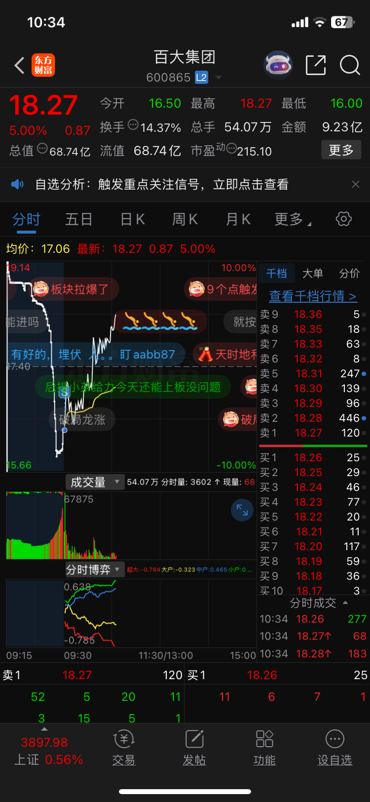 $百大集团(SH600865)$ 竞价哪个出生按的,把我吓出来了。心态爆炸的一天!
