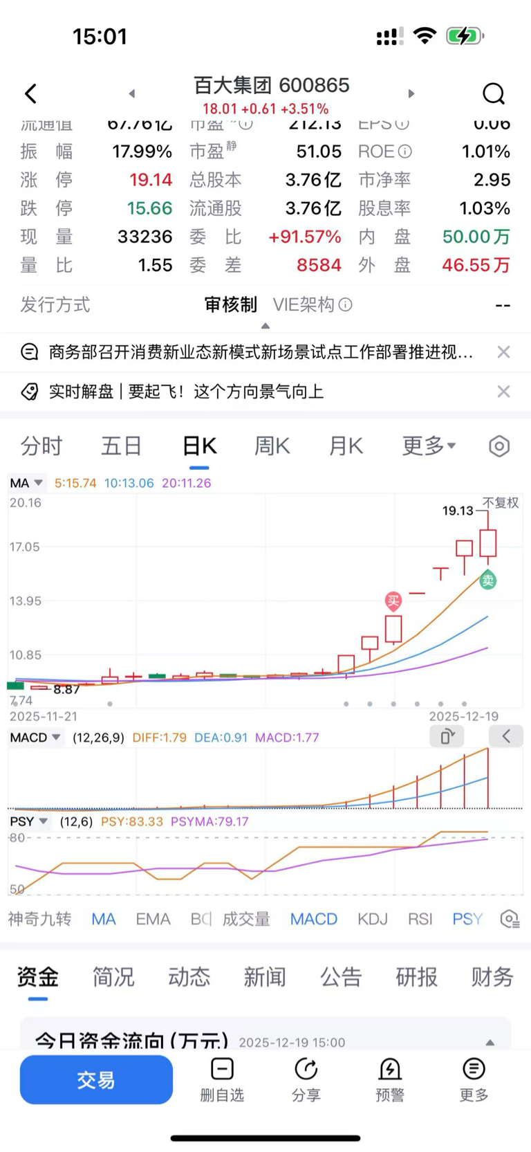 $百大集团(SH600865)$ 100个进去150个出来!满足了哈哈留下的发财