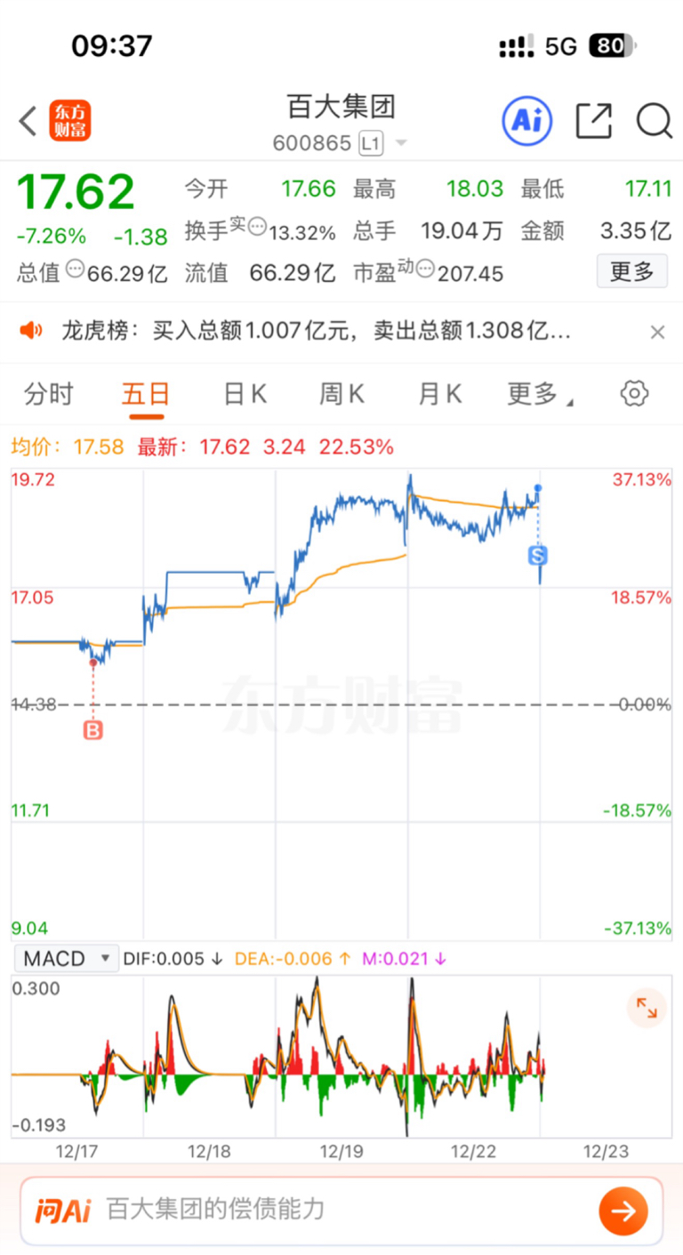 $百大集团(SH600865)$ 昨天提醒卖出,刚刚好,感谢大家的支持和关注!