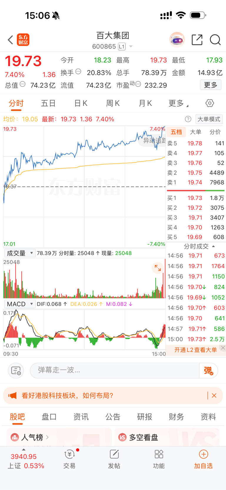 $百大集团(SH600865)$ 百大集团的家人们感谢我吧,没有我这几十万砸盘,不排除收盘就收到19.74,这个票就是第二个海欣食品。1分钱,就1分钱,高一分钱就死了 ,有些人追龙头真的是疯了,把我打算格局的票都逼出来了………