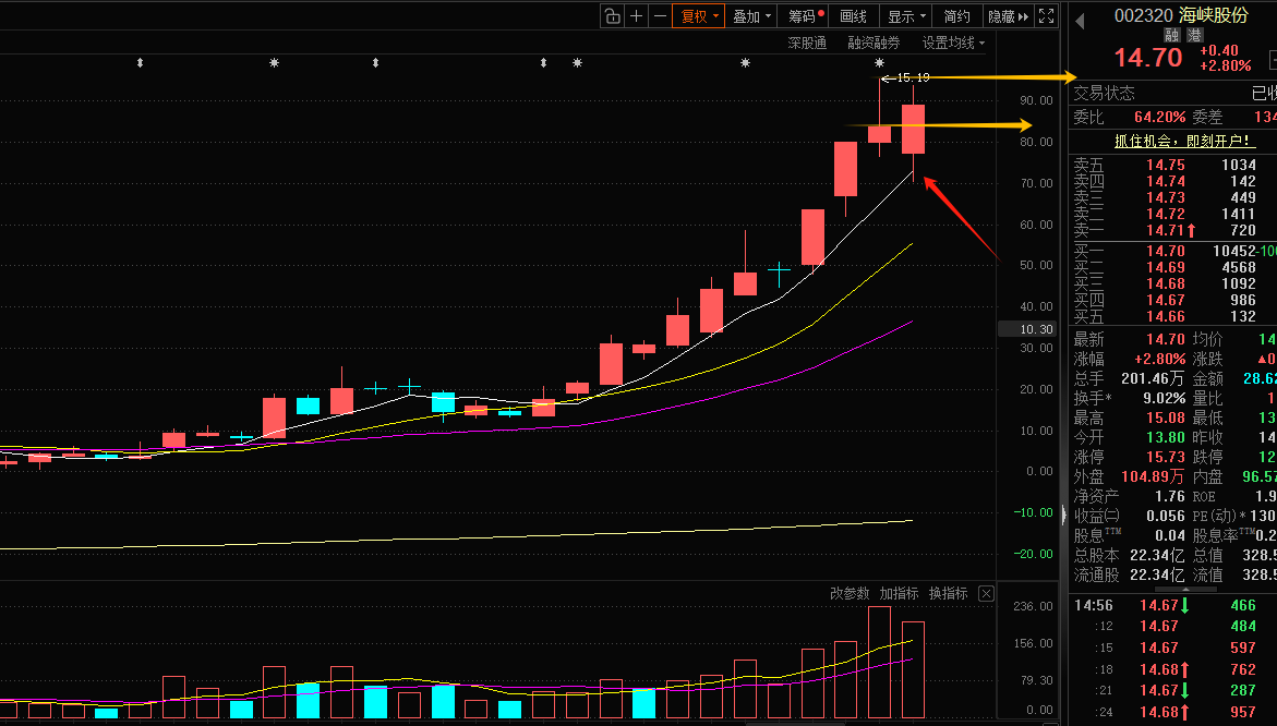海峡股份:海南概念,公司主营业务为船舶运输和轮渡港口服务。今天预期调整,所以早上回踩了5天线,刚好这个位置入了货。随后开始反包,不过今天并没有完成新高,那么明天也许还会低开,由于上方已经没有压力,只有获利盘的兑现可能有影响,所以明天要么越过上面的横线也就是新高,向下最好不要破了前一天的收盘位置。
