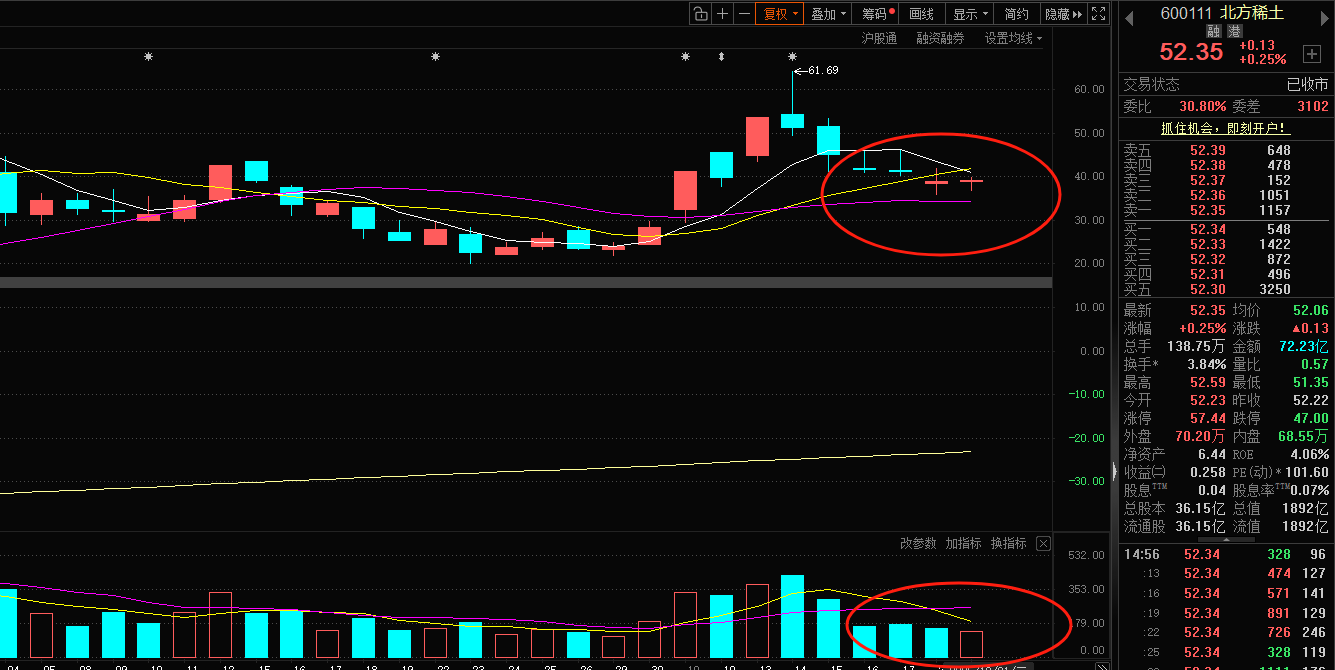 北方稀土:稀土今天仍在企稳盘整当中,所以没什么大的动静,两个下影线。加上连续缩量,要变盘了。