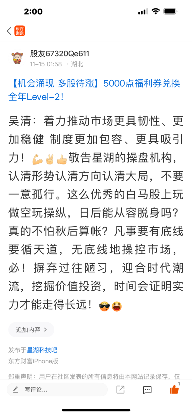 温馨提示: 1.根据《证券法》规定,禁止编造、传播虚假信息或者误导性信息,扰乱证券市场;2.用户在本社区发表的所有资料、言论等仅代表个人观点,与本网站立场无关,不对您构成任何投资建议。用户应基于自己的独立判断,自行决定证券投资并承担相应风险。《东方财富社区管理规定》