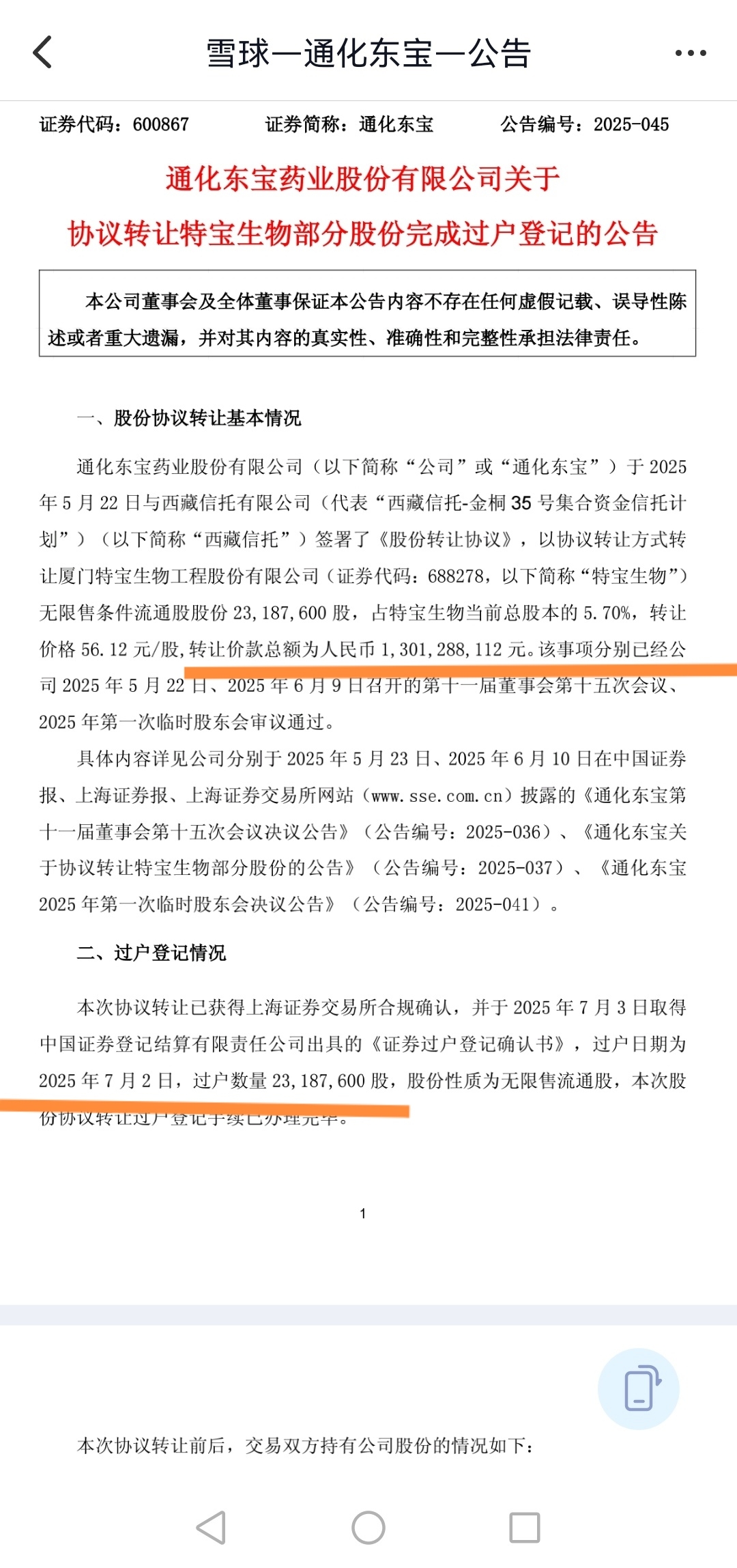 $通化东宝(SH600867)$ 7月2完成了交割,交易金额13亿,扣除原始股价格和税,大部分会计入3季度净利润里面