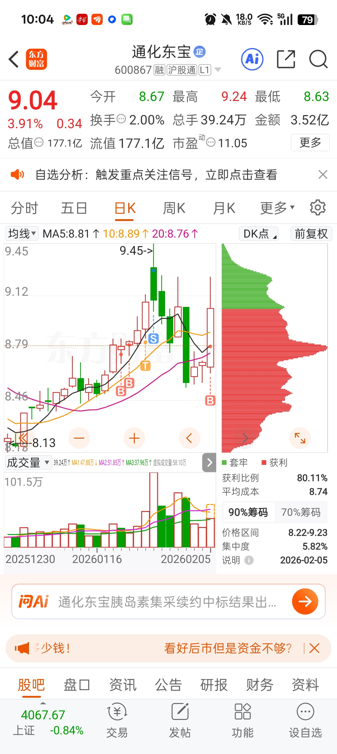 $通化东宝(SH600867)$ 今天能封板就厉害了
