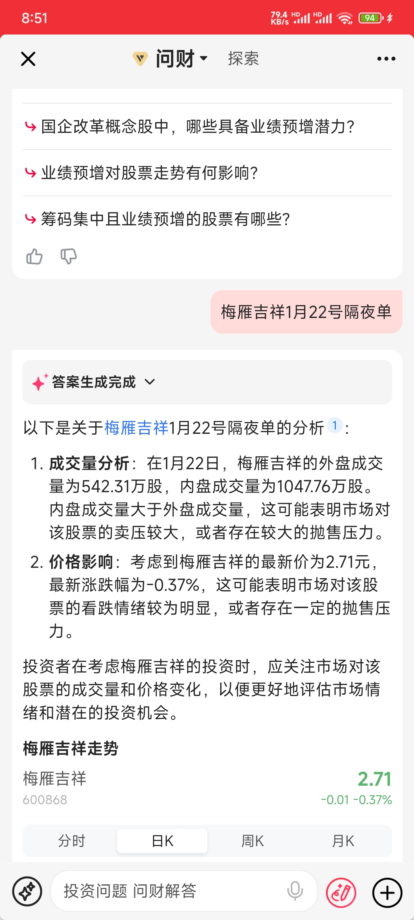 $梅雁吉祥(SH600868)$ 内盘成交量大,明天看来凉凉了。