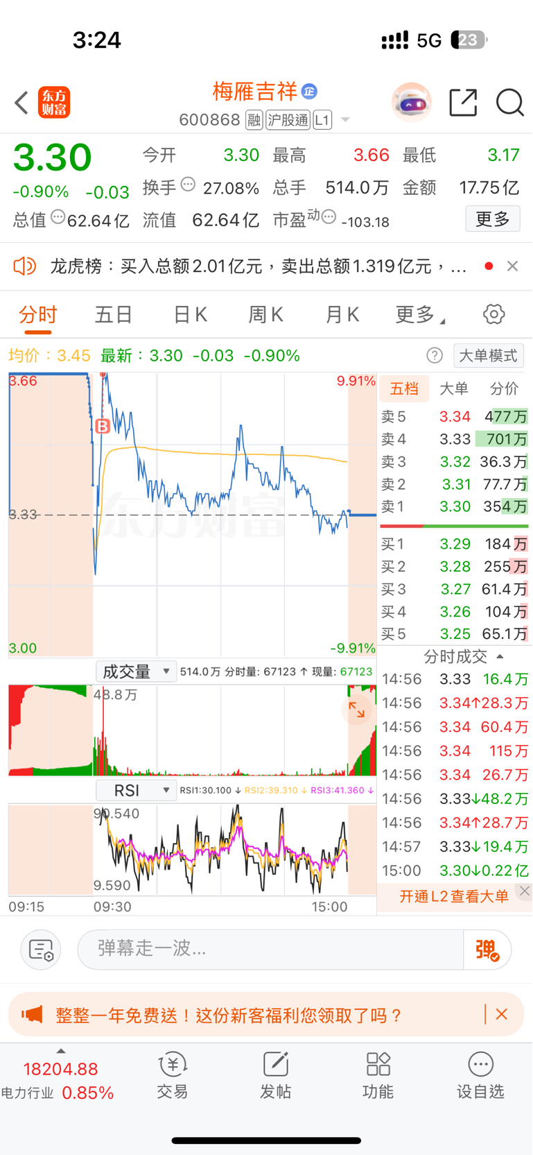 $梅雁吉祥(SH600868)$ 不及时撤单,倒霉了