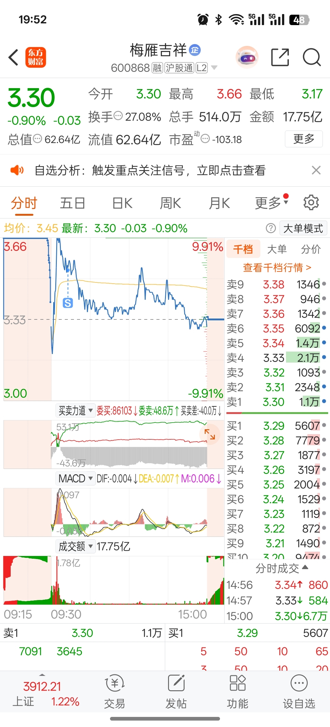 $梅雁吉祥(SH600868)$ 还好跑的快,高位放巨量又炸板不回封,典型高位出货。