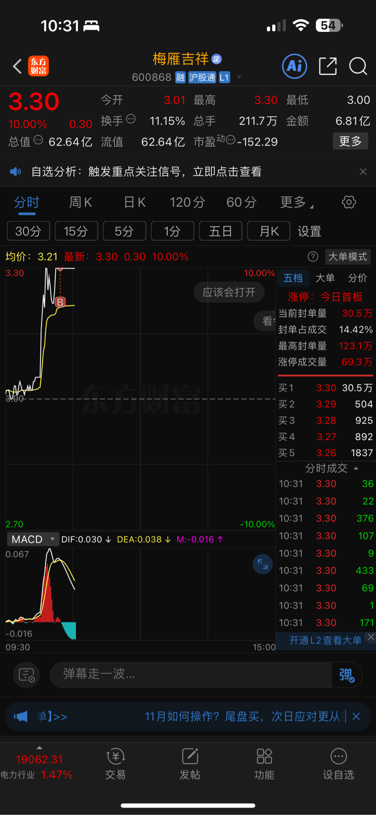 $梅雁吉祥(SH600868)$ 打板进的,慌得一批,会吃面不