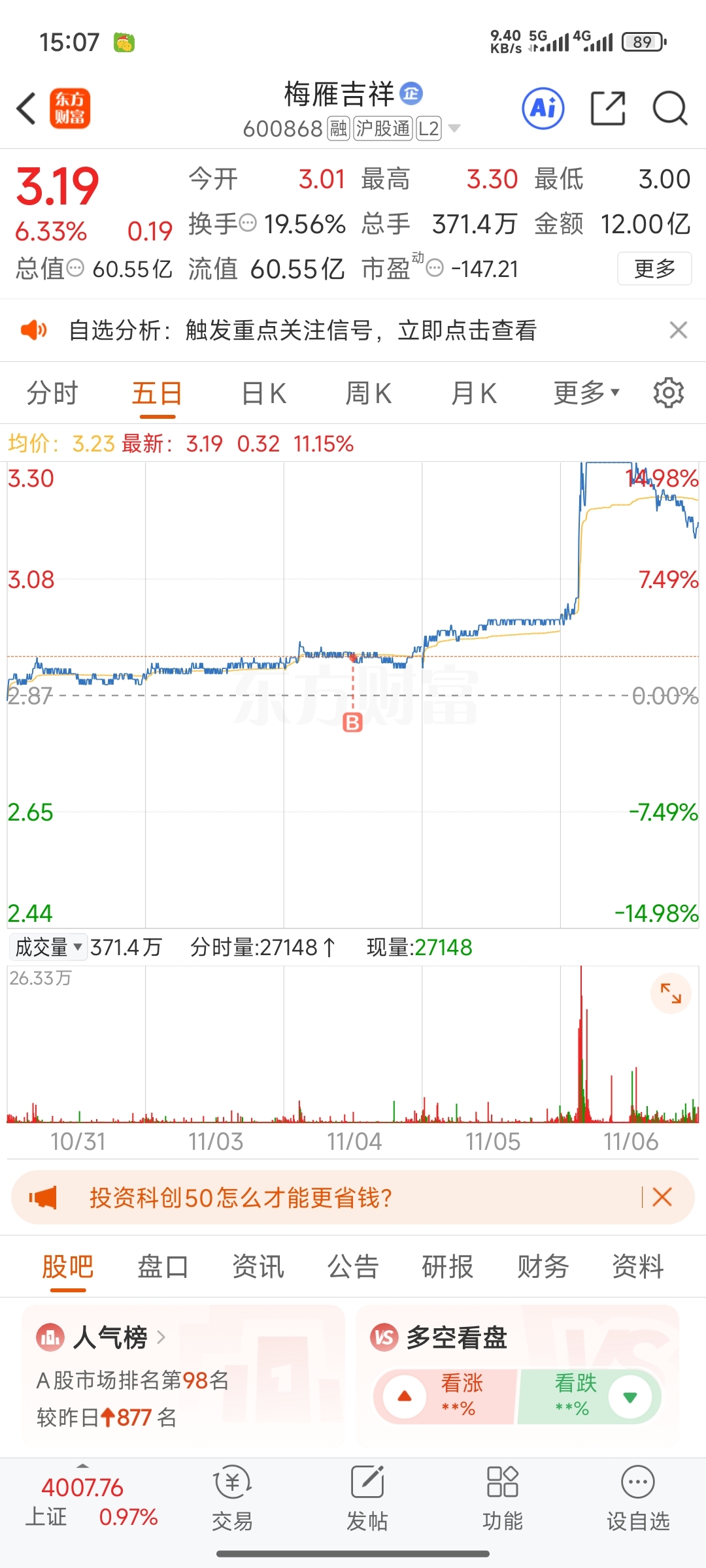 $梅雁吉祥(SH600868)$ 今天想跑还是没有跑,