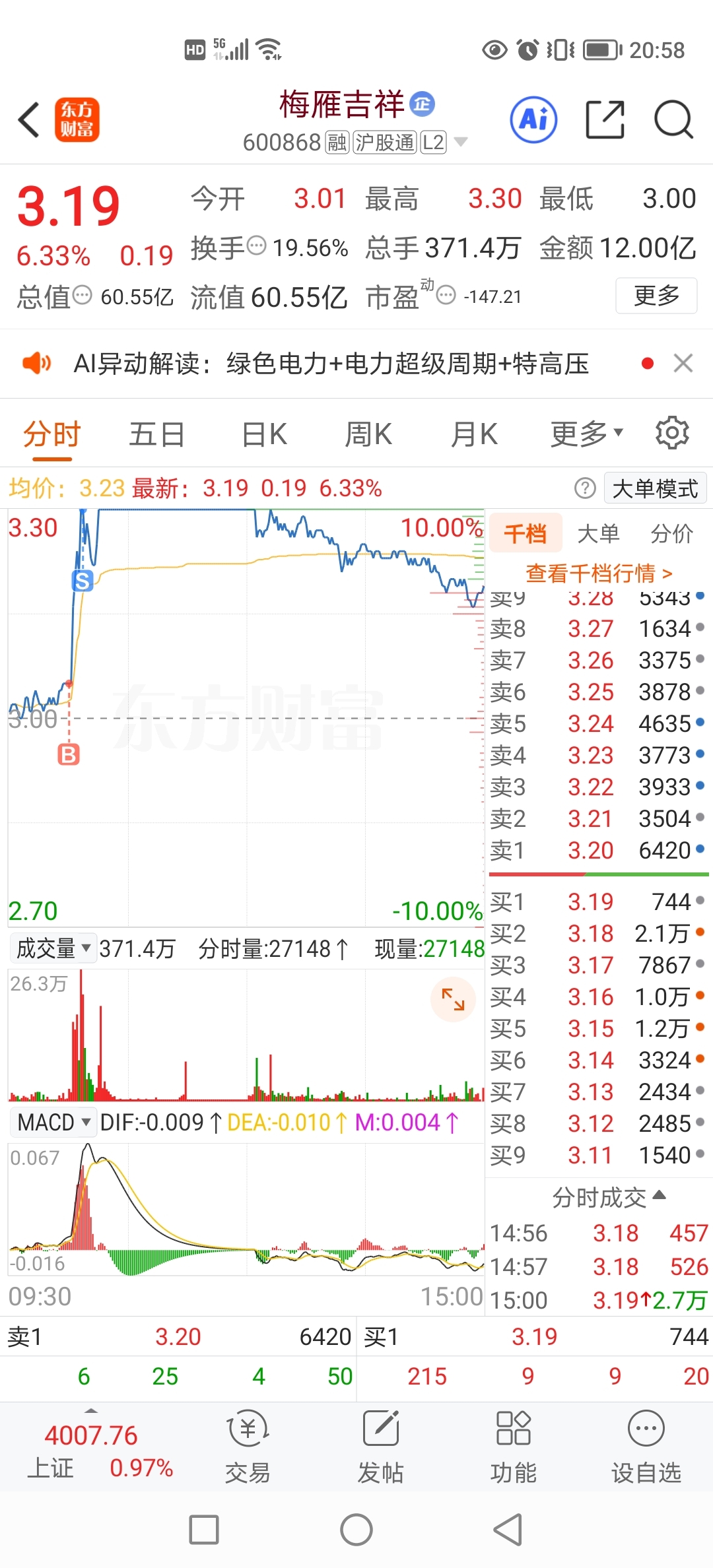 $梅雁吉祥(SH600868)$ 今天灵光一闪,3.05买了800股,感觉能涨停。做了个比较完美的T。