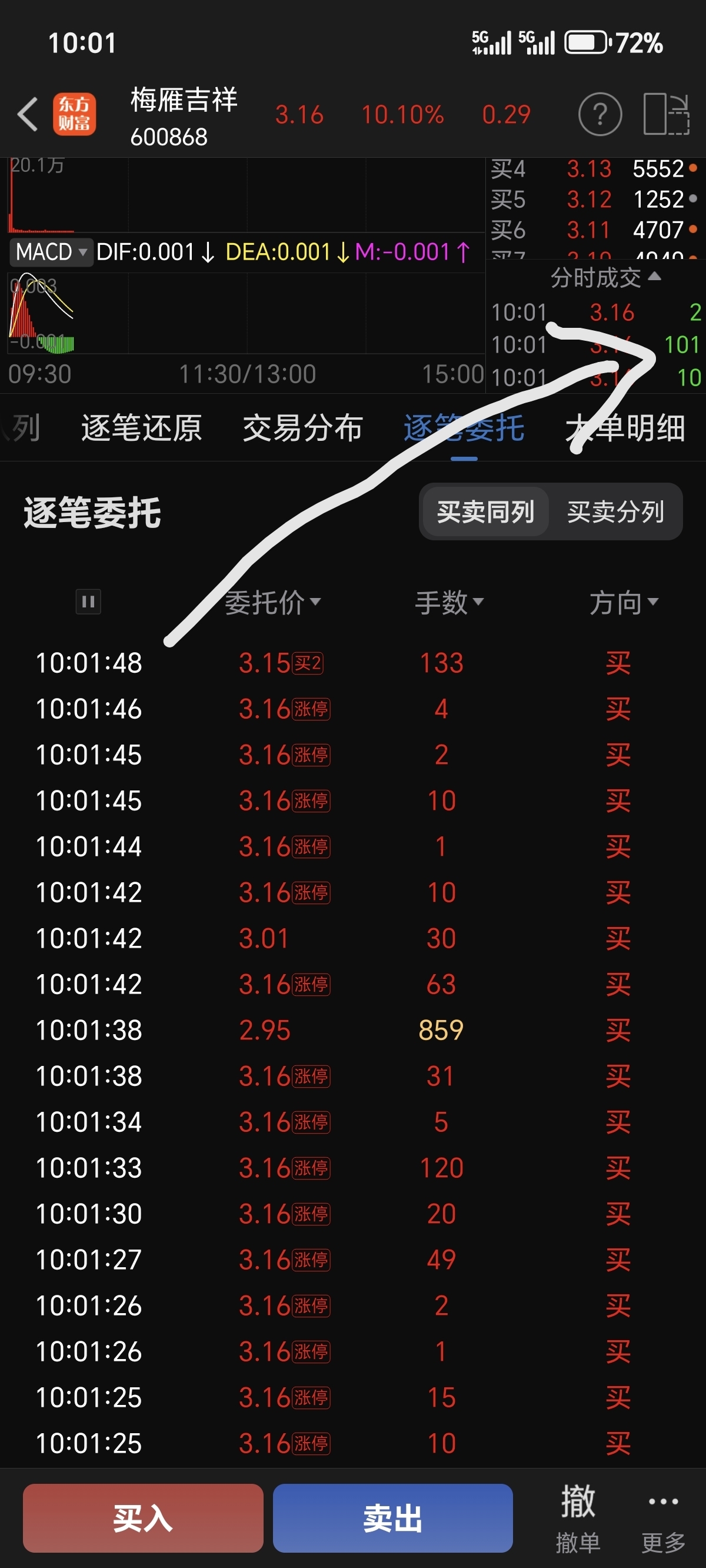 $梅雁吉祥(SH600868)$ 请教一下,刚刚查了一下,从9:30以后就没有逐笔委托的卖单,怎么有的成交呢?就是说只有排队买的,没有卖的怎么有的分时成交?