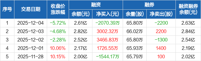 融资方面,当日融资买入5726.35万元,融资偿还7796.74万元,融资净偿还2070.39万元。融券方面,融券卖出0股,融券偿还2200股,融券余量65.8万股,融券余额227.67万元。融资融券余额合计2.63亿元。