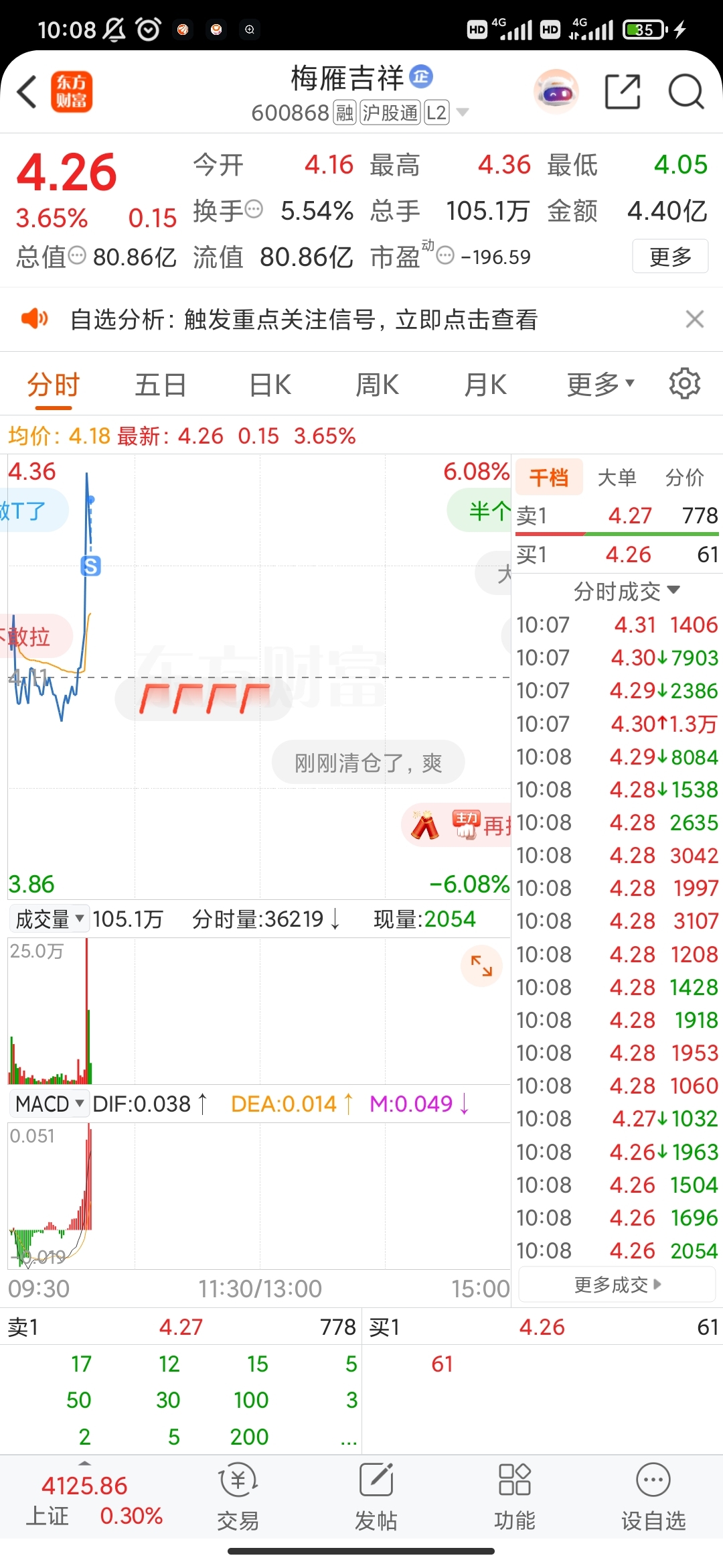 $梅雁吉祥(SH600868)$ 4.31溜了溜了
